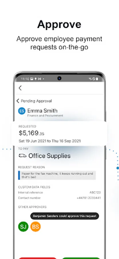 Virtual payment cards can be requested by app users in accordance with your company’s pre-defined policies. Push notifications immediately notify finance managers or approvers of new virtual card requests. Once approved, virtual payment cards are sent directly to your mobile device.