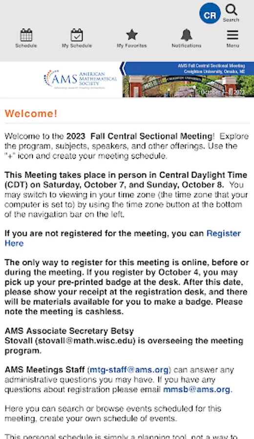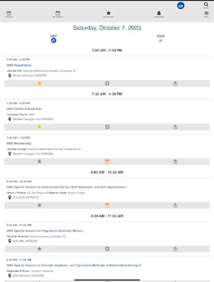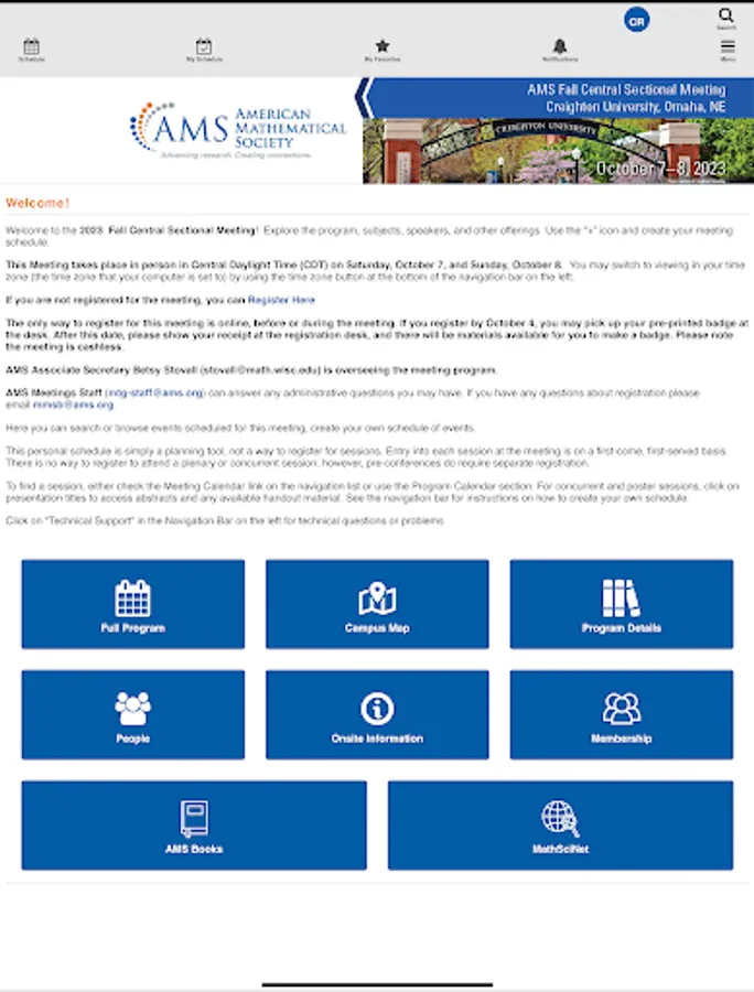 The 2023 AMS Fall Central Sectional Meeting will be held on October 7th-8th, 2023 in Omaha, NE. Login to view Sessions and Papers saved as favorites. View schedules, locations, floor plans, and people. Attendees will now be able to facilitate their experience at the meeting using the mobile app.