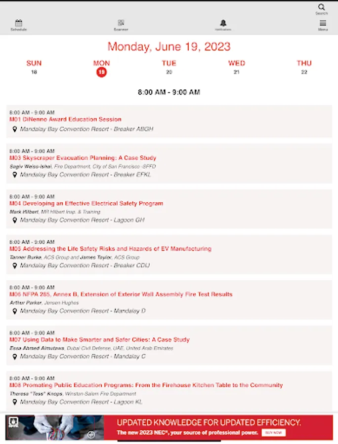 The 2023 NFPA Conference and Expo will take place June 17th-23rd, 2023, in Las Vegas, NV. Login to view Sessions and Papers saved as favorites. View schedules, locations, floor plans, and people. Attendees will now be able to facilitate their experience at the meeting using the mobile app.