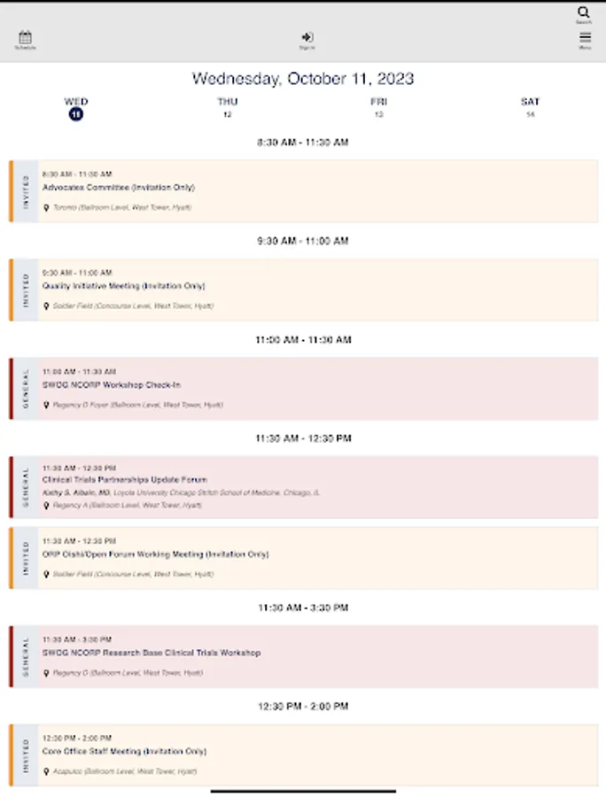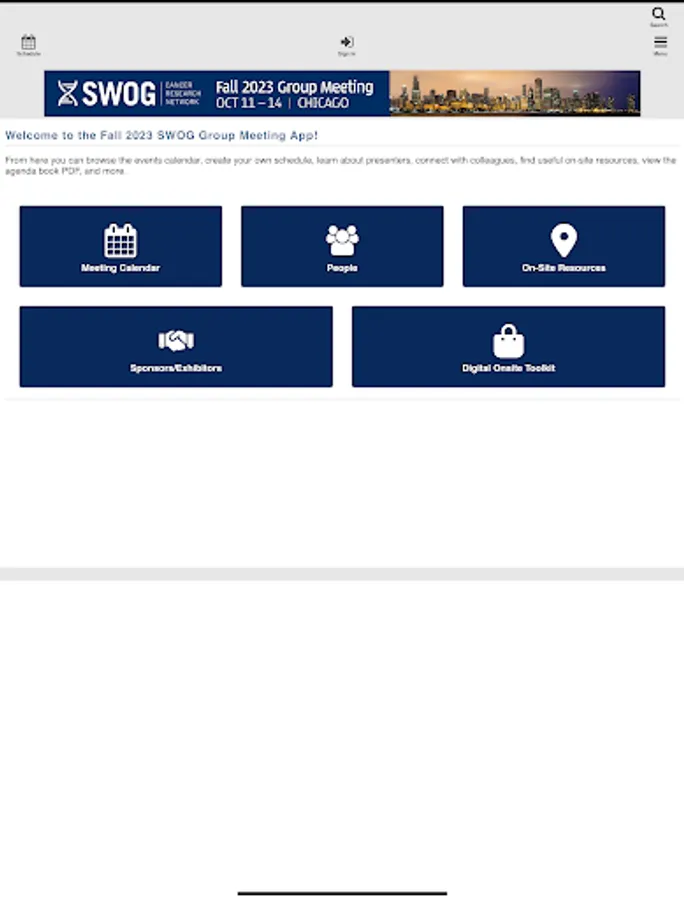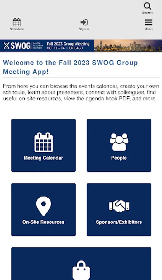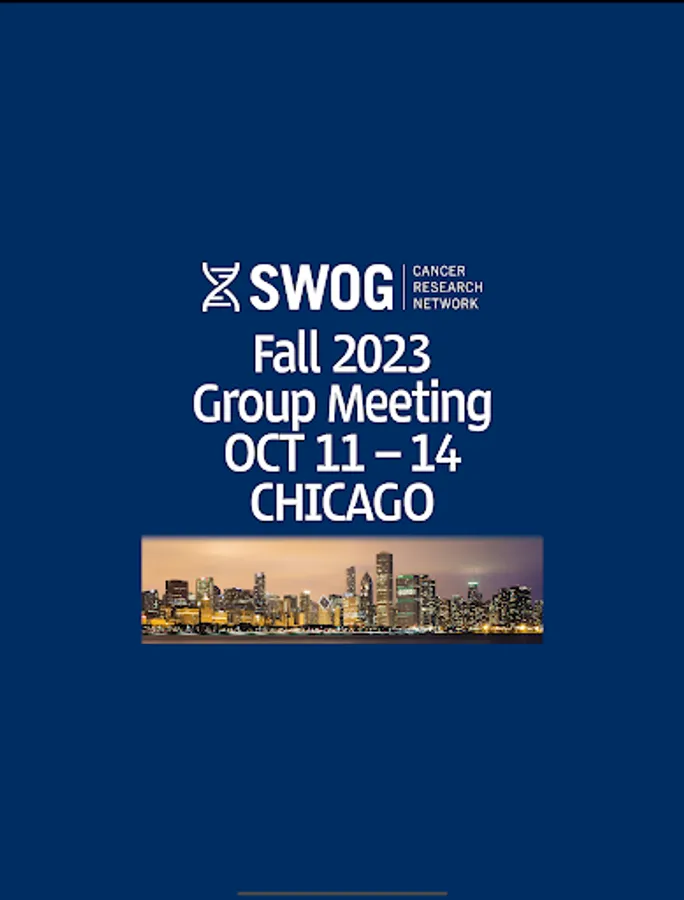 SWOG Fall 2023 Group Meeting will be held on October 11th-14th, 2023 in Chicago, IL. Login to view Sessions and Papers saved as favorites. View schedules, locations, floor plans, and people. Attendees will now be able to facilitate their experience at the meeting using the mobile app.