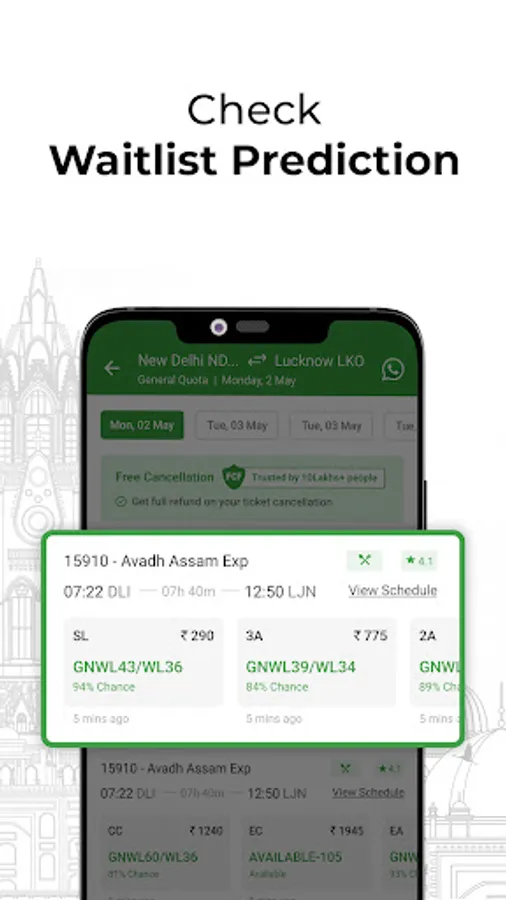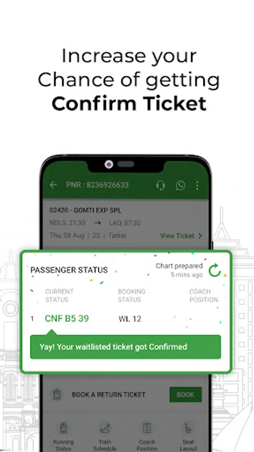 ● Get Confirmed Train Tickets powered by waitlist Prediction and the Same Train Alternates feature.