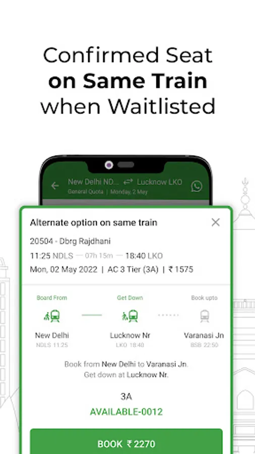 With ConfirmTkt same train alternates, you can find hidden confirm train tickets by changing your boarding/dropping point. With ConfirmTkt's accurate prediction, even if the ticket is on the waitlist, your ticket will get confirmed if the ConfirmTkt forecast is green, so go ahead and book your train ticket with assurance.