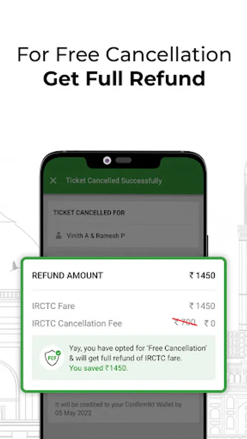With the ConfirmTkt Free Cancellation feature, get an instant and full refund.