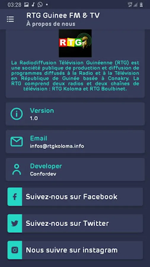 Radiodiffusion Télévision Guinéenne (RTG) is a public company producing and broadcasting programs broadcast on Radio and Television in the Republic of Guinea based in Conakry. The RTG comprises two radio stations and two television channels: RTG Koloma and RTG Boulbinet.