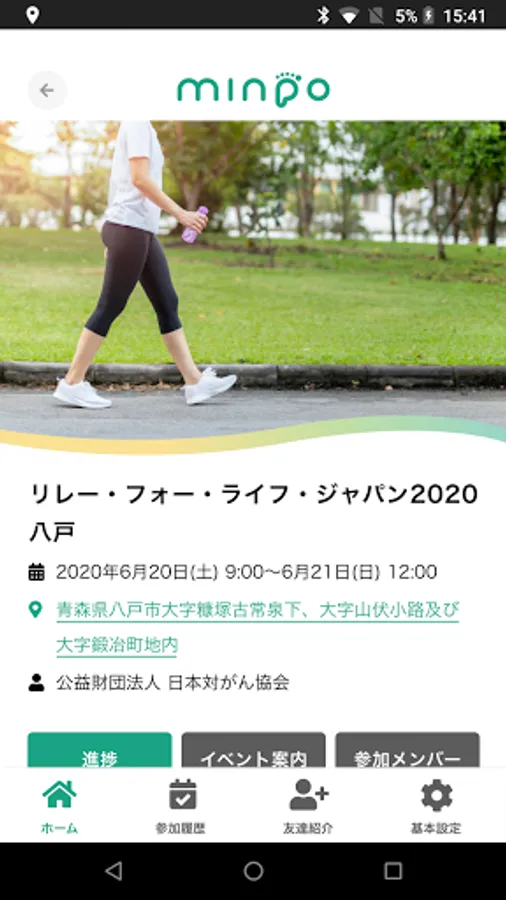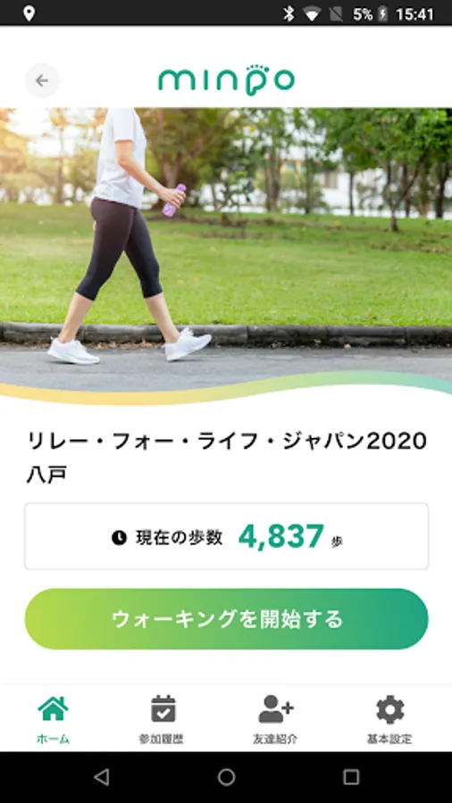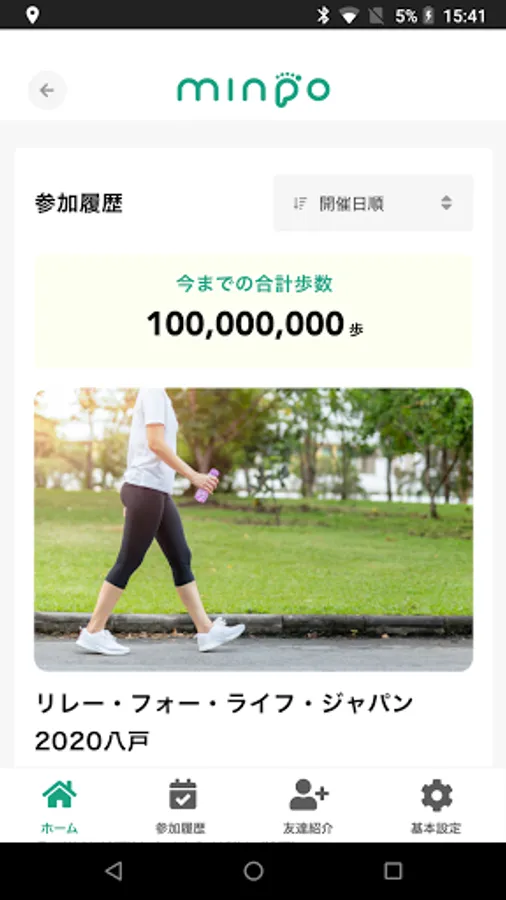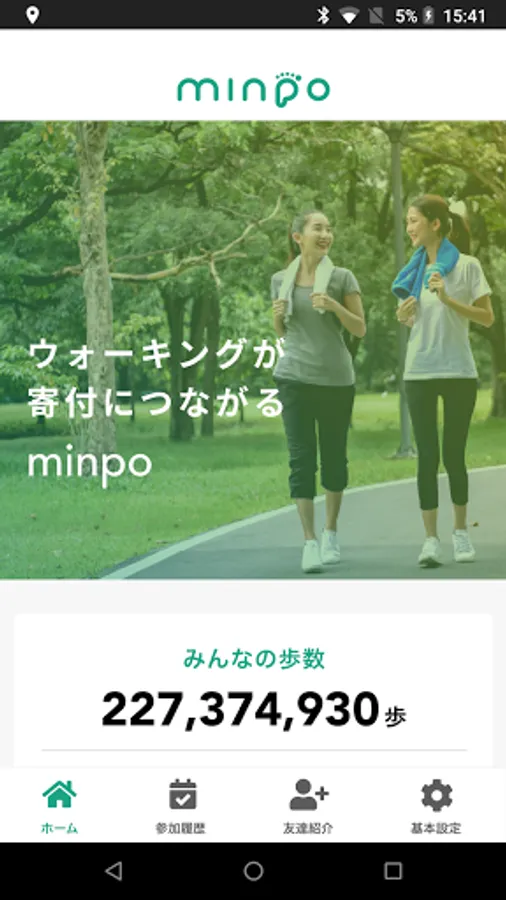 Walking leads to donations "minpo" is a charity / donation app that allows you to participate online in walking events of NPOs and companies. By using the app, the number of steps you have taken is automatically measured, and the number of steps taken by the participants in the event and the total number of steps taken by all the participants are totaled.