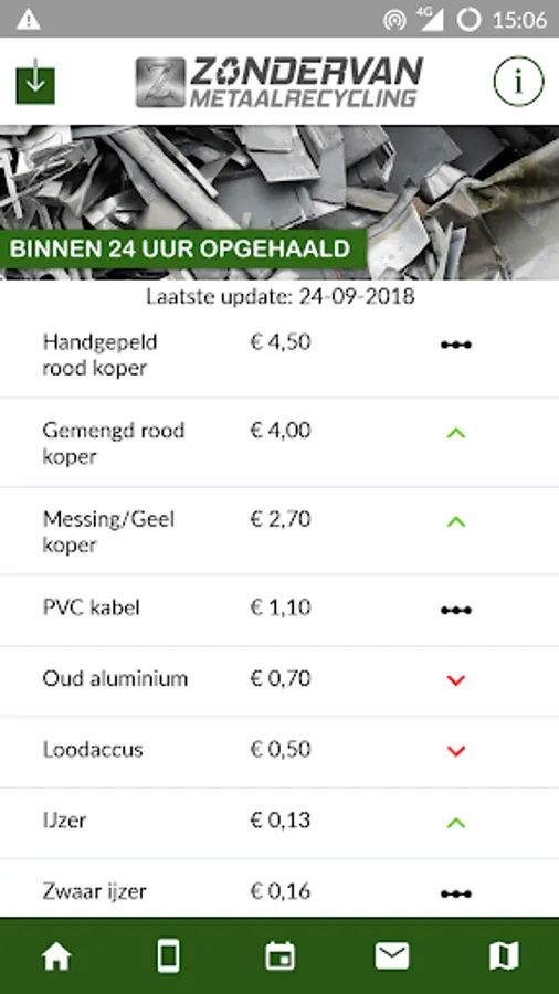 Stay up to date with the latest return prices of, for example, old iron? Download the app for the current scrap prices of Zondervan Metaalrecycling. The prices are renewed daily.