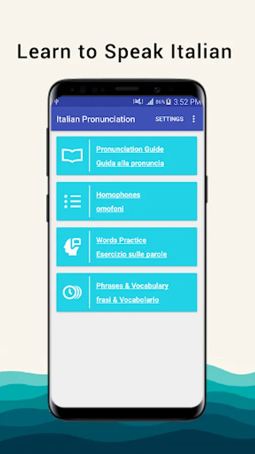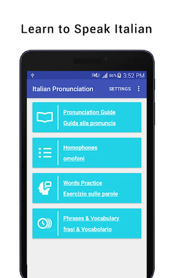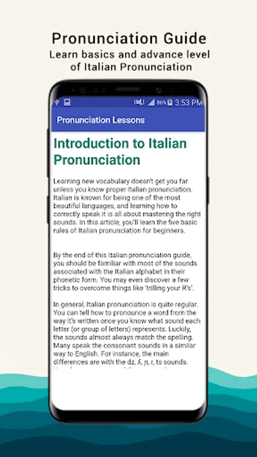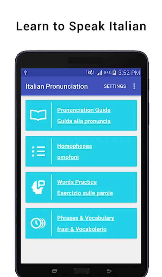 This is an ultimate Italian pronunciation guide with full offline support, for both students and teachers. The Italian Pronunciation app helps you learn, practice and play with Italian words. Italian Pronunciation app teaches you how to pronounce Italian text, words and or phrases properly. Italian pronunciation: learn to speak Italian, speak it right!
