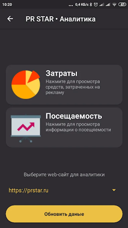 You can always be in touch with your customers and at any time analyze the effectiveness of your advertising campaigns. To enter the application you will need a login and password from the site PRSTAR.ru. After authorization, you can see from the mobile phone all references from your site and analytics of your users' interactions with feedback forms.