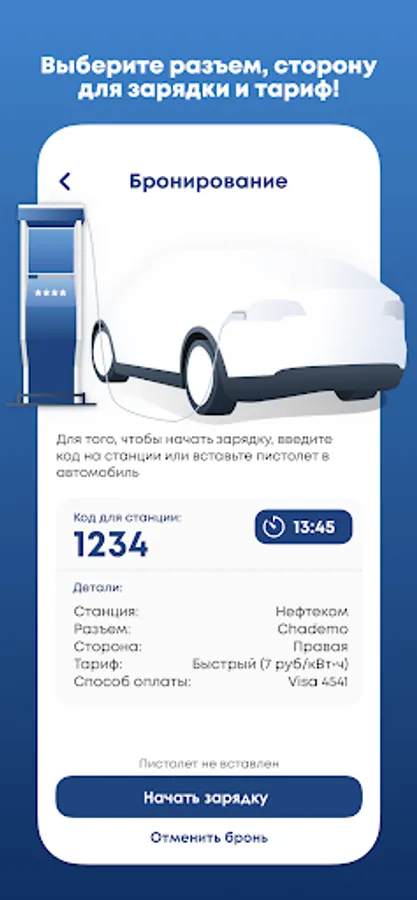 Choose a suitable station and book the required connector. The reservation is valid for 15 minutes. Connect the charging port to the electric vehicle and enter the code. You have started charging successfully. You can end the session either through the mobile application or directly at the station.