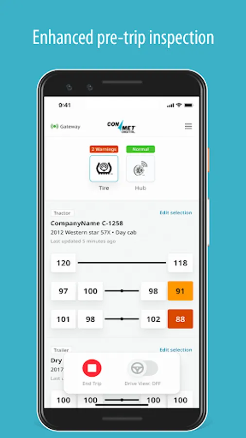 The ConMet Digital Driver app gives transportation fleet drivers instant visibility to critical information about the assets they operate, maintain and manage. Includes helpful info to complete driver vehicle inspection reports and real-time, actionable alerts so drivers can take action on urgent safety and maintenance needs. Access requires a ConMet Digital account profile and log-in. Request a full demo at https://conmet.com/innovation/digital/