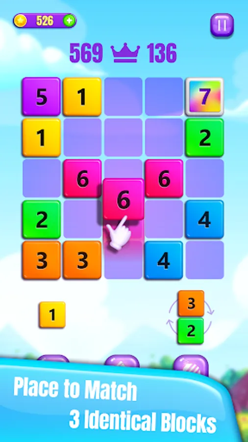 ✔ Place 3 blocks of the same kind next to each other to merge dominoes into the next number block.