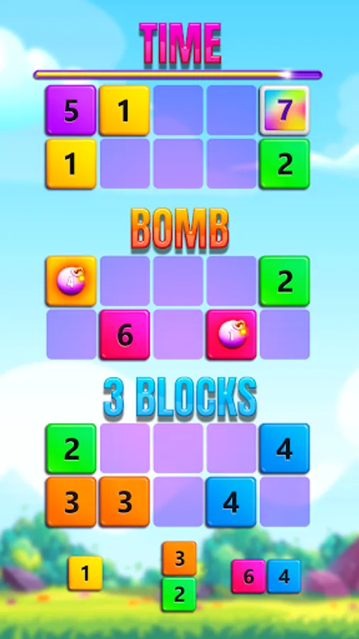 ◾ Bomb - Merge blocks of the same color to diffuse bombs. If a bomb's counter reaches zero, it is game over.