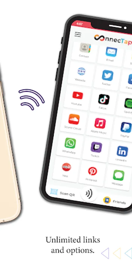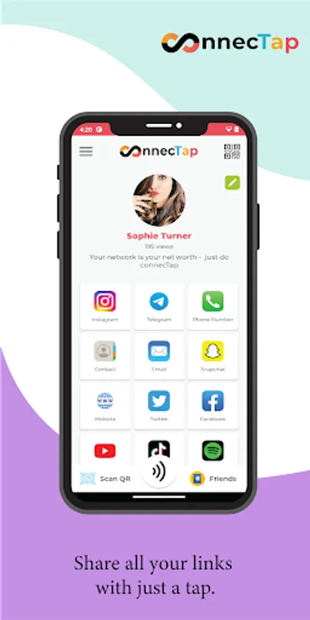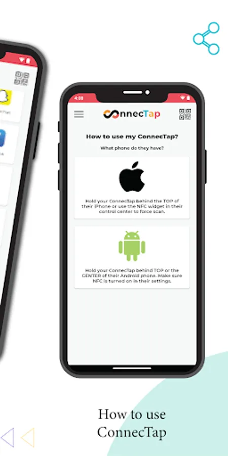 To share a profile simply tap the NFC tag to a phone having NFC or let anyone scan your in-app QR code. Make sure Android phones have NFC turned on in settings. Others won't need the app or a ConnecTap to receive your information.
