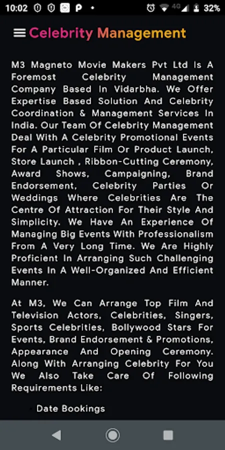 M3 Magneto Movie Makers Pvt Ltd is a foremost Celebrity management company based in Vidarbha. We offer expertise based solutions and Celebrity Coordination & Management Services in India. Our team of celebrity management deal with a Celebrity Promotional Events for a Particular Film or Product launch, Store launch, Ribbon-Cutting Ceremony, Award Shows, Campaigning, Brand Endorsement, Celebrity Parties or Weddings where Celebrities are the Centre of Attraction for their Style and simplicity. We have an Experience of managing big events with professionalism for a very long time. We are highly proficient in arranging such challenging events in a well-organized and efficient manner.