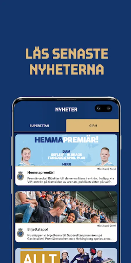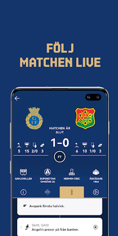 Gefle IF Live is the best way to follow the team and the Superettan. Here in our official app, you stay up-to-date on everything about the matches and the team. Buy and manage your tickets, share videos with goals and match events. Subscribe to news, follow the matches via live score, keep track of the table, shooting league and historical statistics.