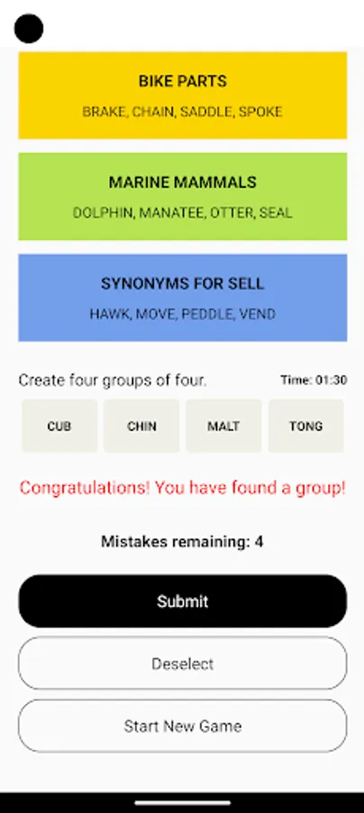 To play, select the items you believe form a group and tap 'Submit'. The game will indicate if your guess is correct, assigning a color to each identified group. Remember, the categories are always more specific than merely "5-letter words", "names", or "verbs" – they require your analytical thinking and imagination!