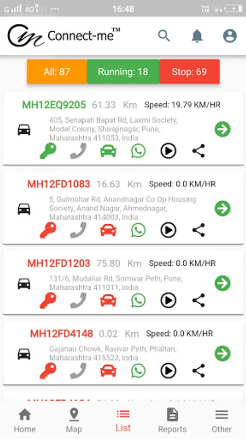 * Reports :- Stoppage Report, K.M. Report, Ignition on / Off Report, Performance Report, Travel Summary etc.