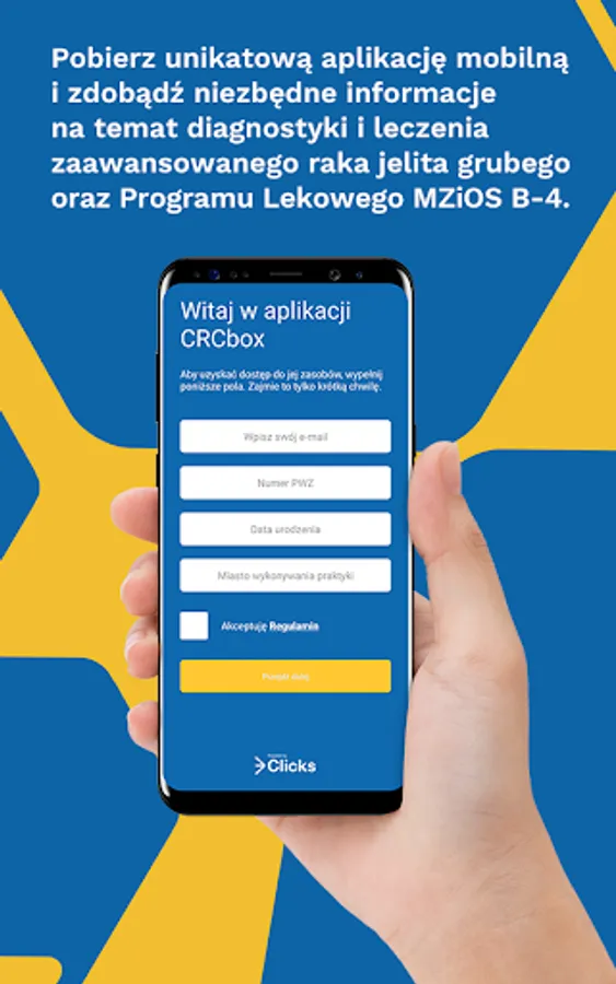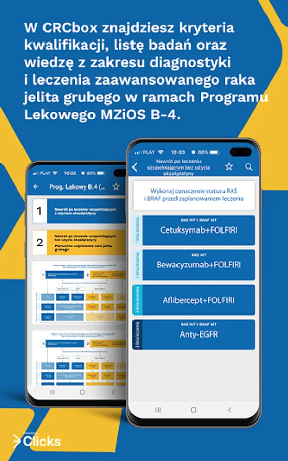 CRCbox is a mobile application based on 3Clicks platform, designed specifically for oncologists who diagnose and treat patients with advanced colon cancer. CRCbox offers quick and intuitive access to essential medical information on diagnostics and treatment of patients with advanced colon cancer covered by MZiOS B-4 Drug Program