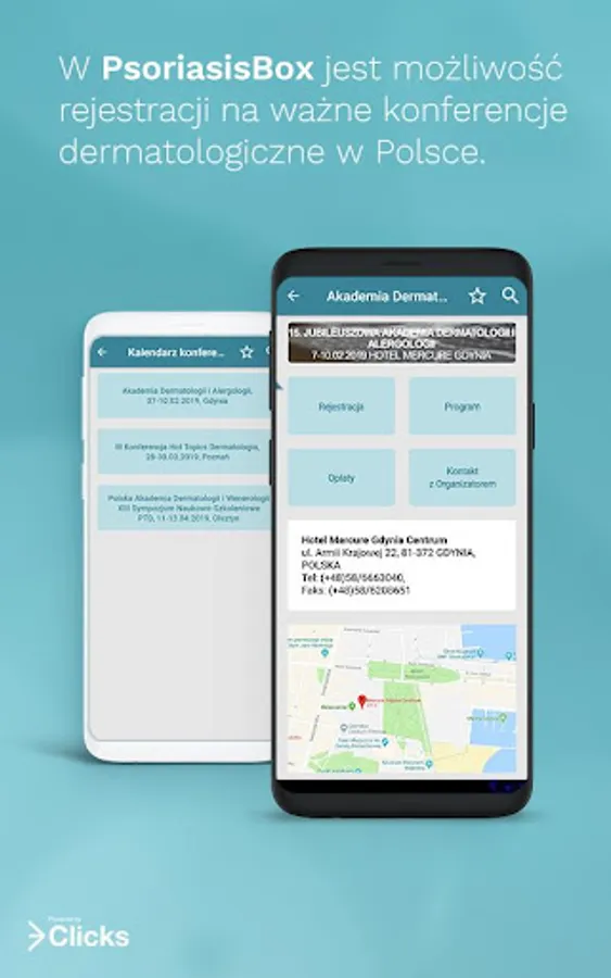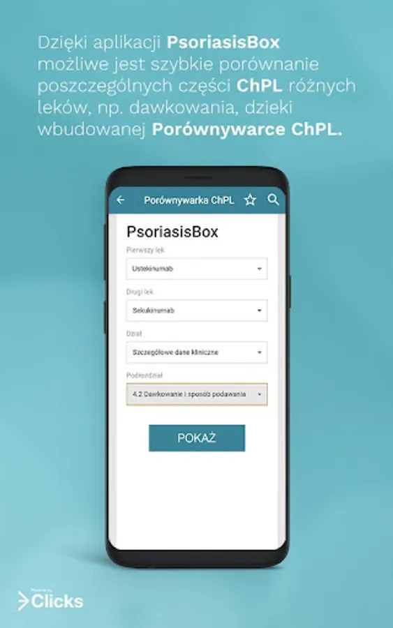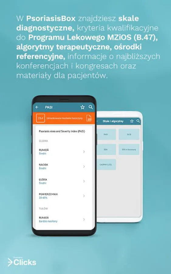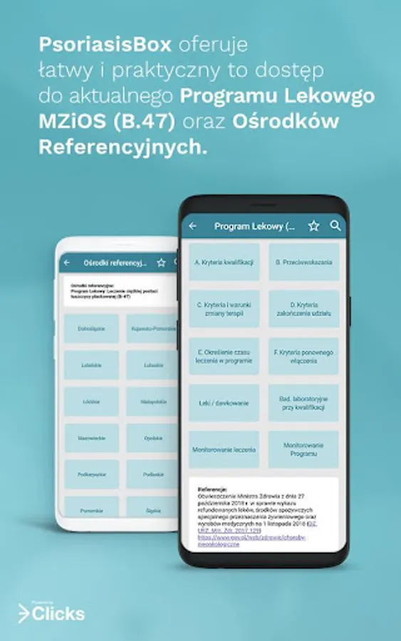 Download the latest 3Clicks’ app: PsoriasisBox and get essential information supporting diagnosis and treatment of psoriasis. In PsoriasisBox you will find diagnostic scales, therapeutic algorithms, reference centres, information about upcoming conferences and congresses, eligibility criteria for the special reimbursement program (B.47) and materials for patients.