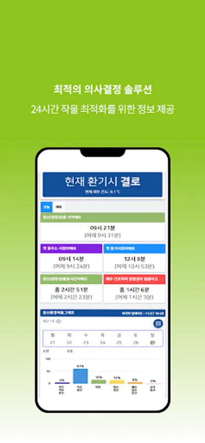 - Provide tomorrow’s forecast ventilation, irrigation, and transpiration suitability information- Provide daily transpiration environment ratio graphs- Provide day and night average temperature applicable to cultivation technology, day and night temperature difference, daily average temperature, etc. 2. Smart farm yield and disease and pest collection service- On flowering days Provision of predictive harvest time according to harvest data management and yield comparison function- Pest data management and pest notification service in our neighborhood 4. Agricultural community - Farmers across the country can participate to share cultivation knowledge, use it as a job posting board, and a marketplace bulletin board