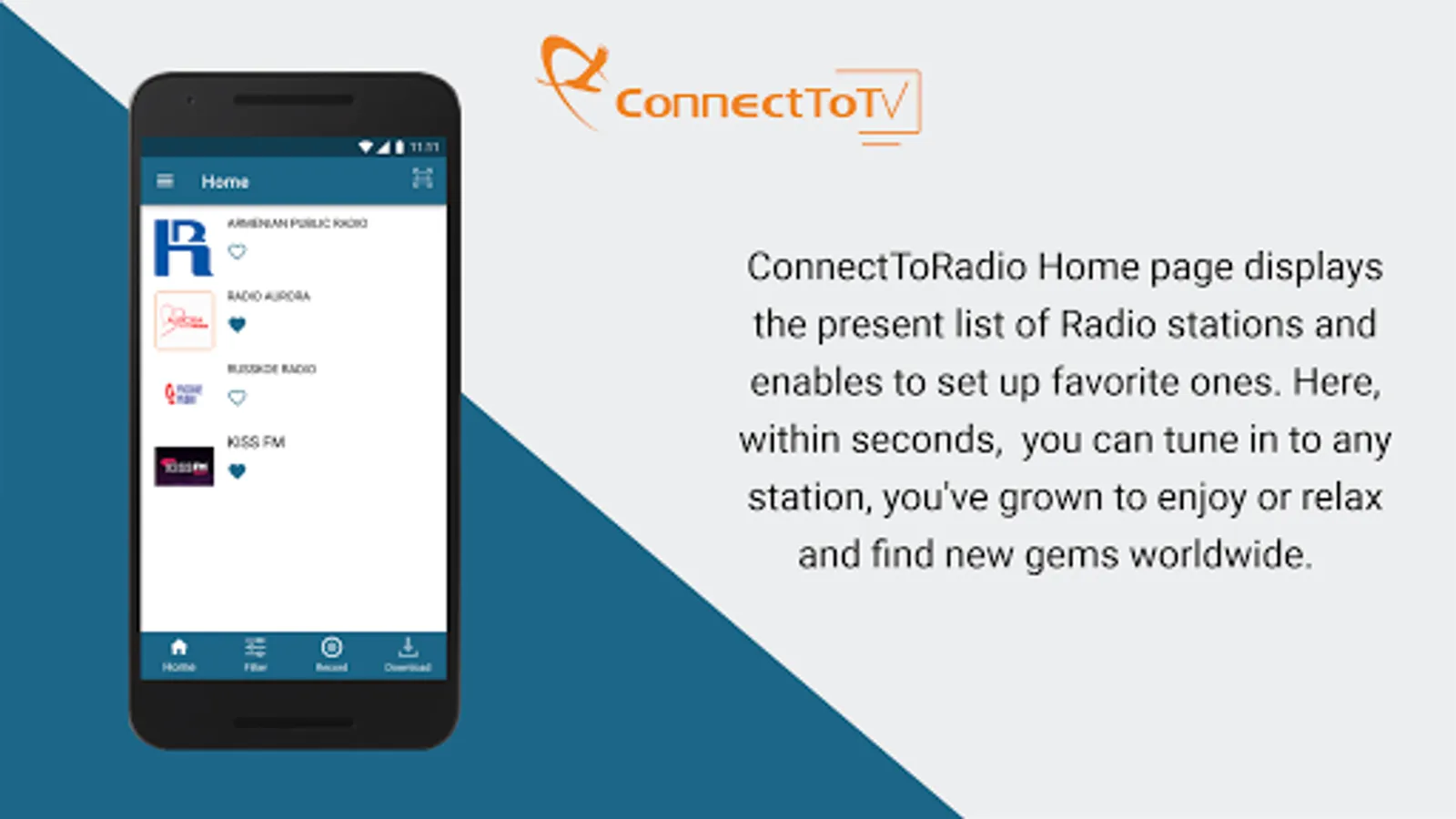 ConnectToRadio is our latest product, which enables to listen to radio on your phone. Any channel can be added to the list of your favorite channels, and you will enjoy your beloved free internet radio stations on the go. ConnectToRadio also has the functionality of scanning all the radio channels, by playing them one after another for a few seconds in order for the users to find a track meeting their listening preferences and play it. Thus, you can find the music you enjoy, or let it find you.