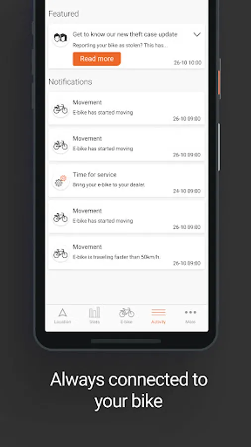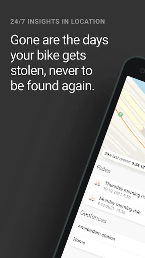 Our app grants you a near real-time 24/7 insight in your bike's current location and whereabouts, even if it's not you riding the bike. The GPS is installed inside your bike and gives you peace of mind wherever your bike takes you.