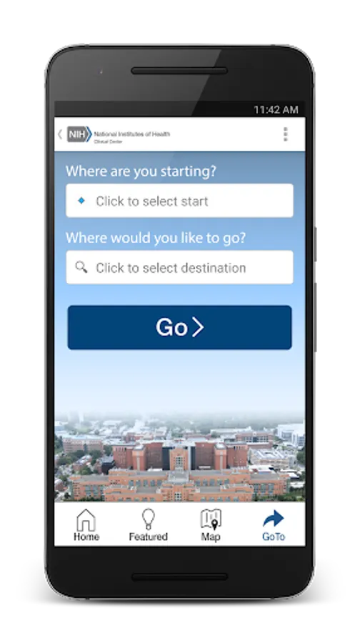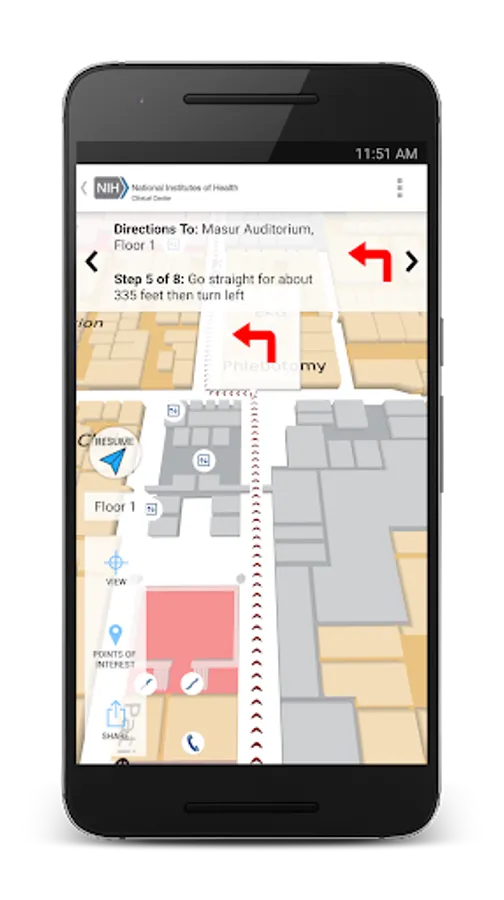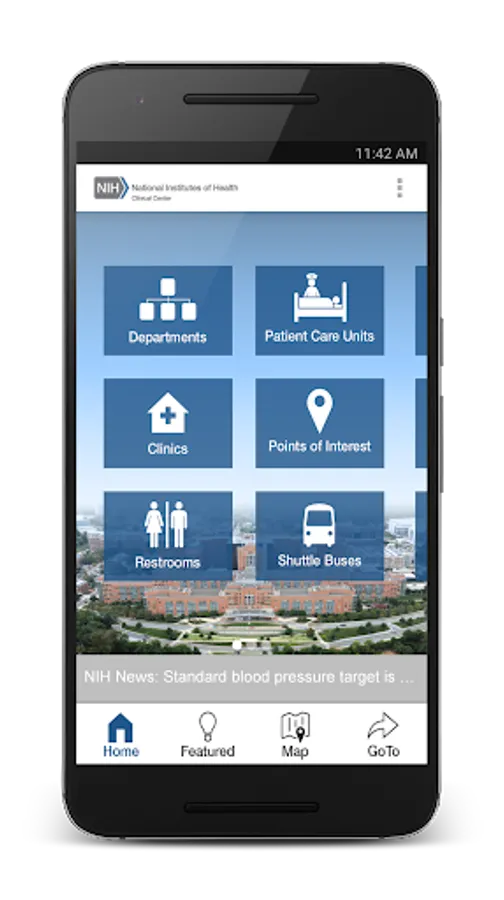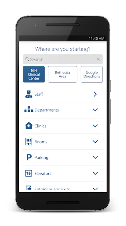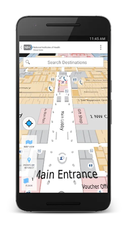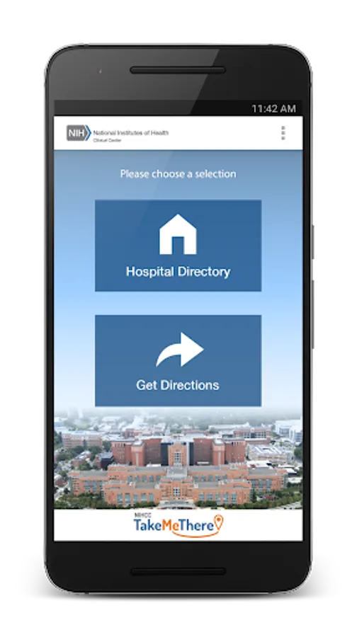 Now there is an easier way to navigate inside the NIH Clinical Center Hospital. Our smartphone app, NIHCC Take Me There , gives you turn-by-turn directions within the hospital. Not only can you ask any of our friendly employees for directions or follow our thorough signage, your smartphone can tell where you are within the hospital and help you reach your destination quickly and easily.
