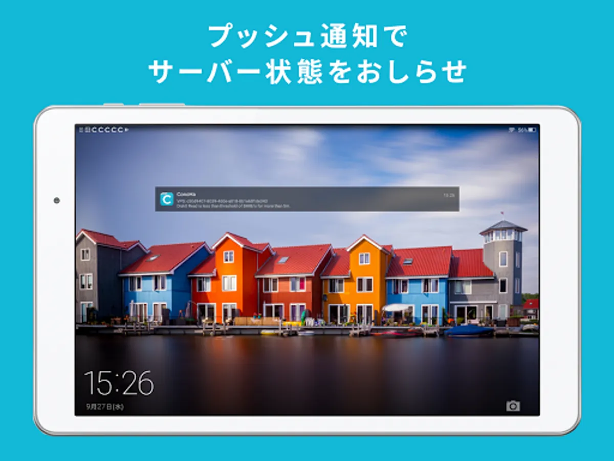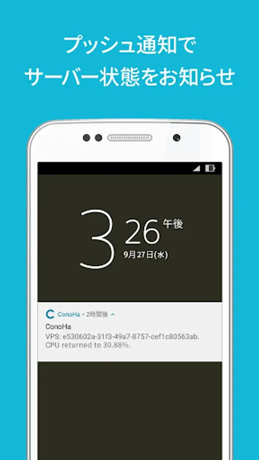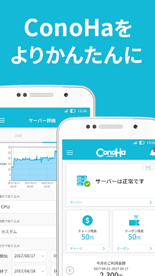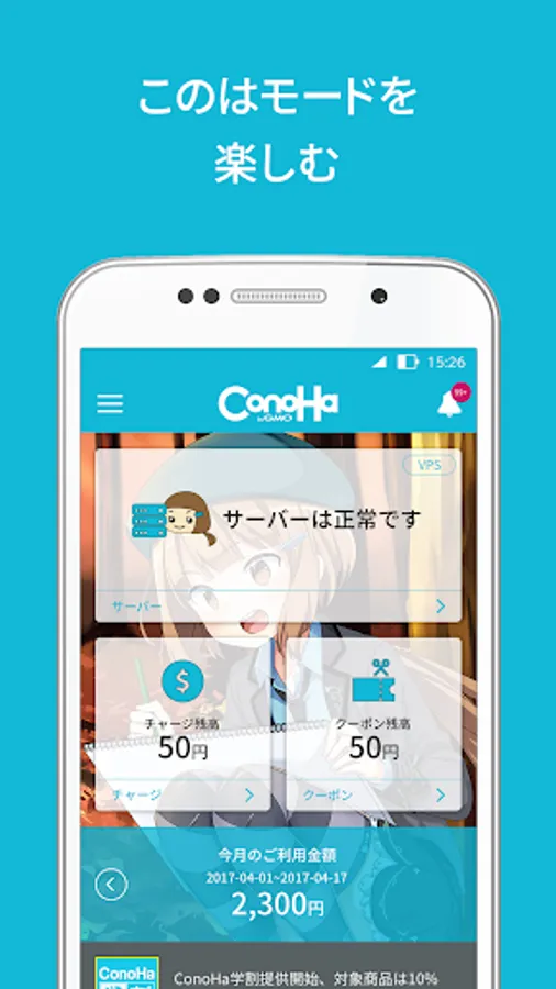 "ConoHa Mobile" is the first domestic smartphone application for cloud hosting service that enables easy server monitoring and management anytime and anywhere. In addition to customizing the control panel of the simple and easy-to-use "ConoHa" for the application, it is equipped with a push notification function that notifies the server status and charge balance.