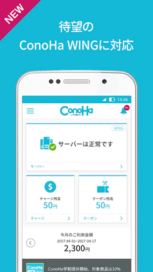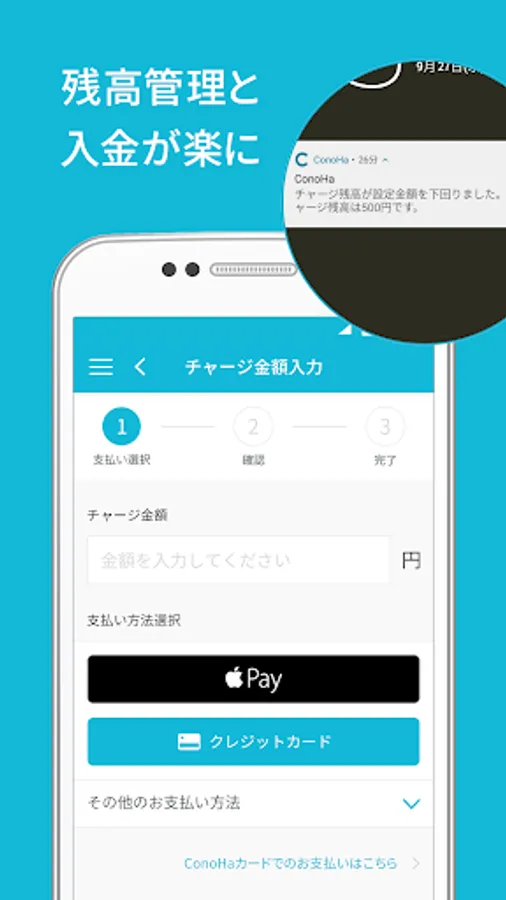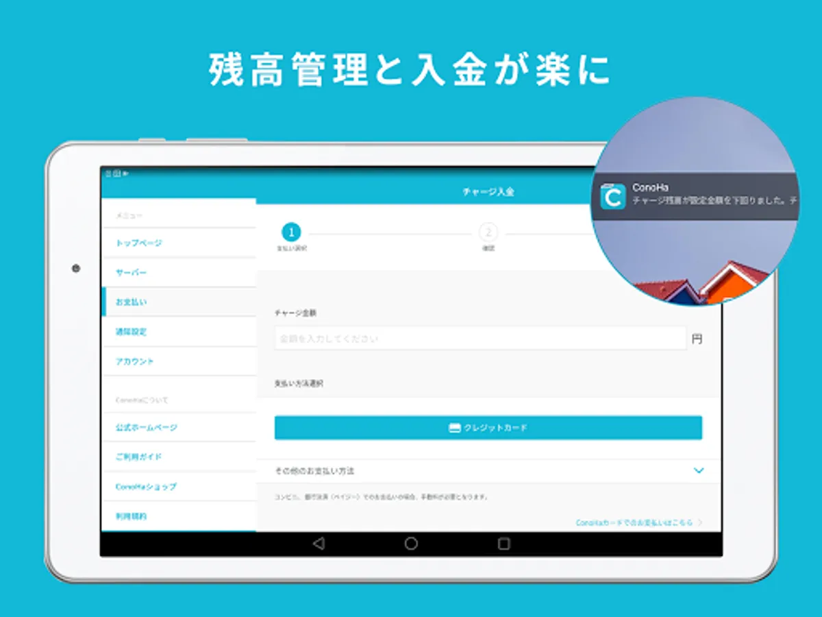 As a payment method for server usage charges, customers using "ConoHa Charge" who receive prepayment can receive push notification when the charge balance is insufficient. In addition, we have prepared a list page with a card image so that you can conveniently manage "Coupon card" "Coupon card" which can be used to pay the usage charge.