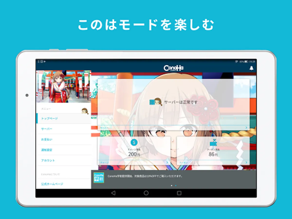 We offer the highly acclaimed "This is the mode" in the PC version with an original design for smartphone applications. Please enjoy "Mikumo This Haha" of various expressions that can only be seen on "ConoHa Mobile".