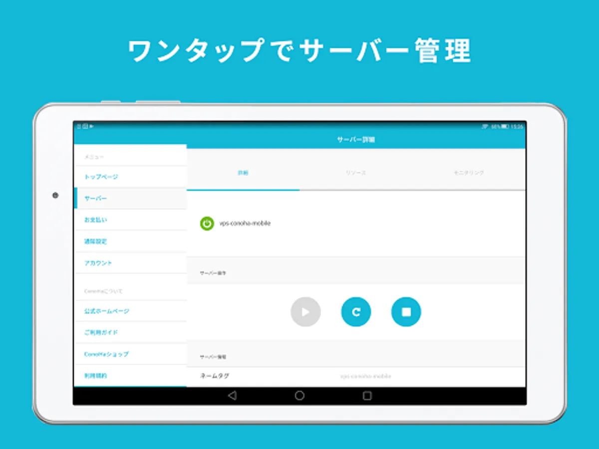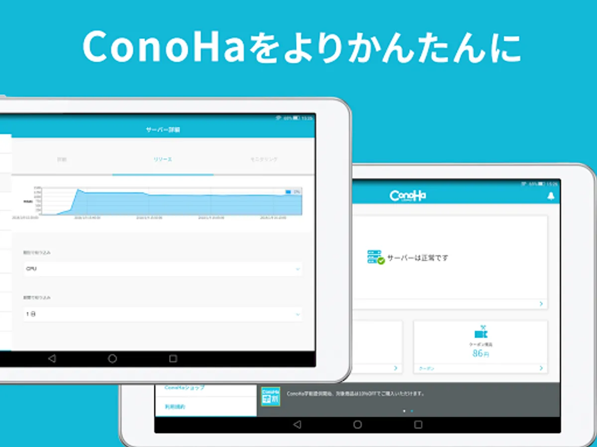 Customize the control panel of PC version "ConoHa" that is simple and easy to use for smartphone application. Basic operations of the server as well as confirmation of server information and resource graphs can be performed conveniently and intuitively by those who are used to the PC version without discomfort.