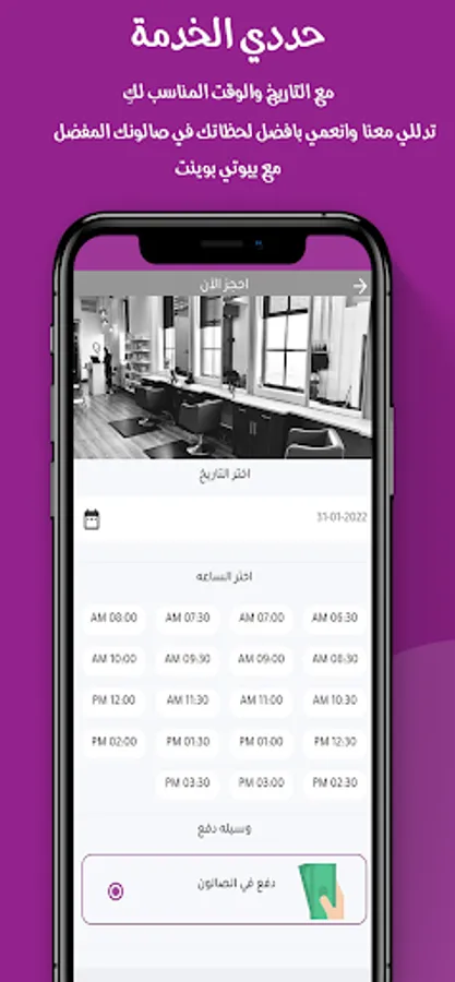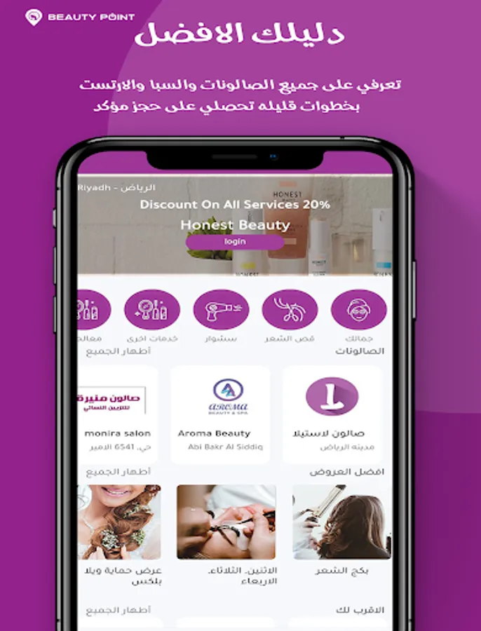 Beauty Point application, a platform that brings together salons, beauty clinics, beauty experts and home services in various cities and regions of the Kingdom of Saudi Arabia, through which you can manage your project with all flexibility and safety. Introduction, it also contains other features, including: