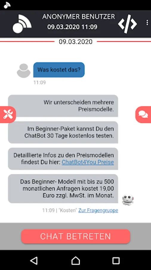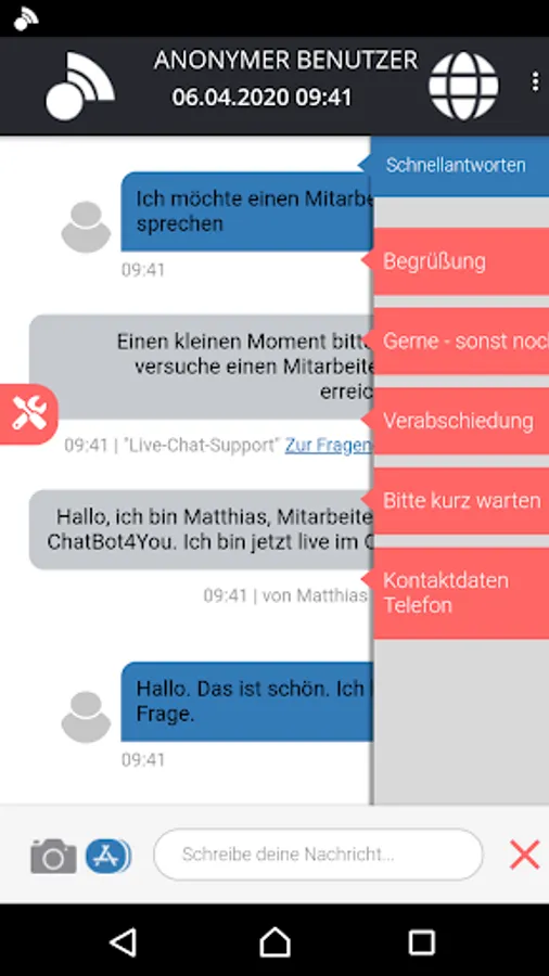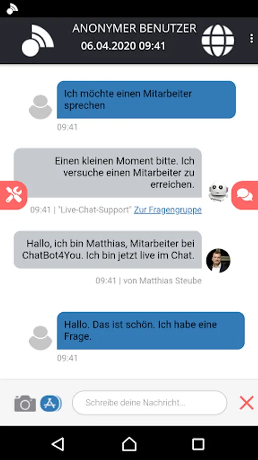 With the ChatBot4You live chat app, we make it even easier for you as a ChatBot4You user to get in touch with your customers. You will receive a PUSH notification on your mobile phone for every incoming chat message and can start the conversation with the customer directly via the ChatBot4You app.