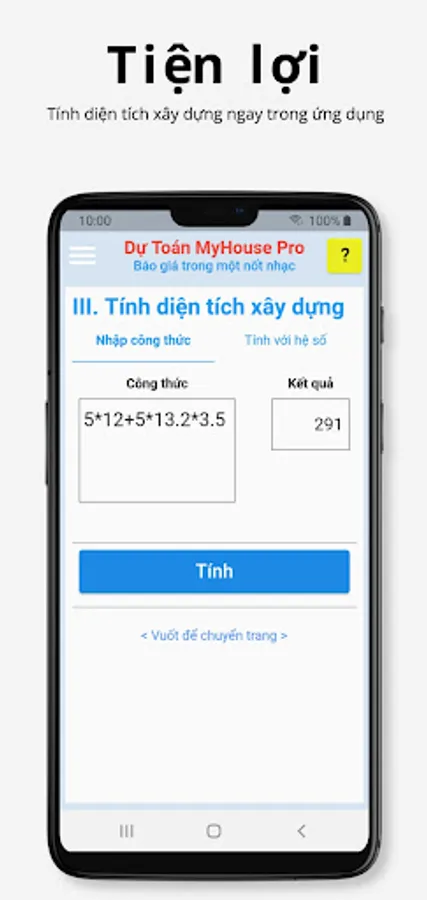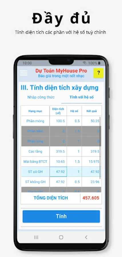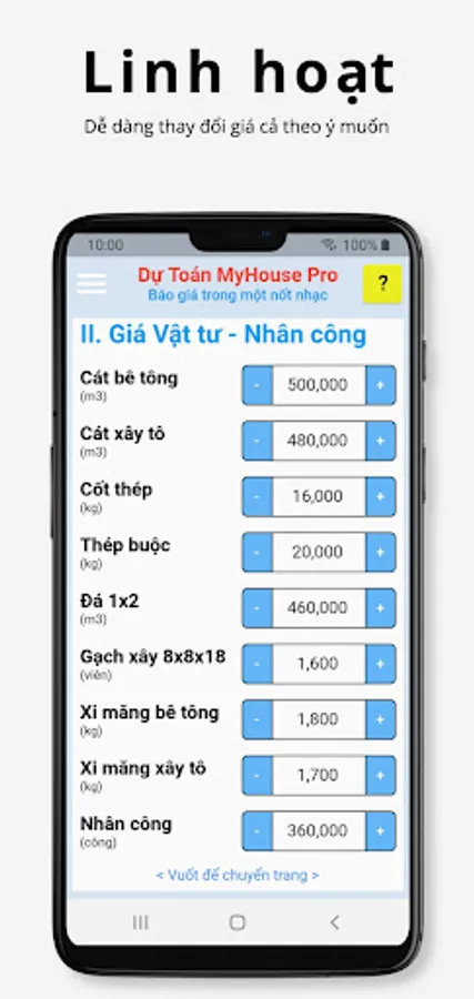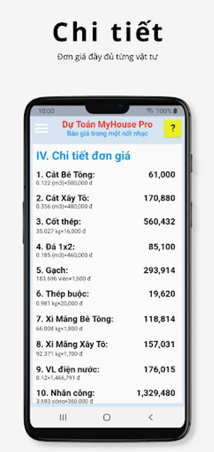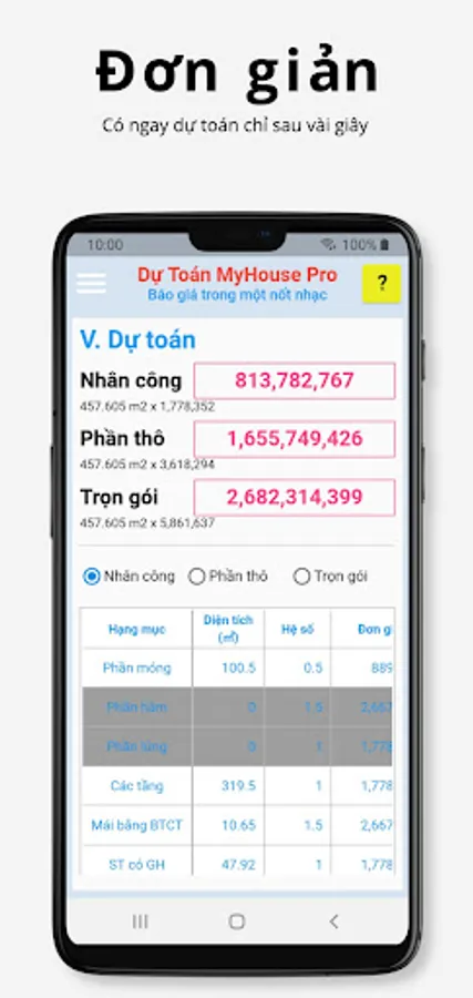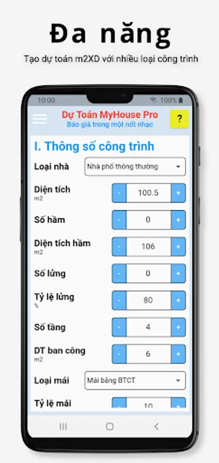 - Very suitable for contractors, just a few taps on the phone to immediately have an accurate estimate for a quote. No longer do you have to sit and mentally calculate how the unit price of cement, steel, and labor goes up and down.