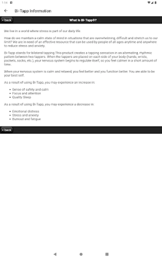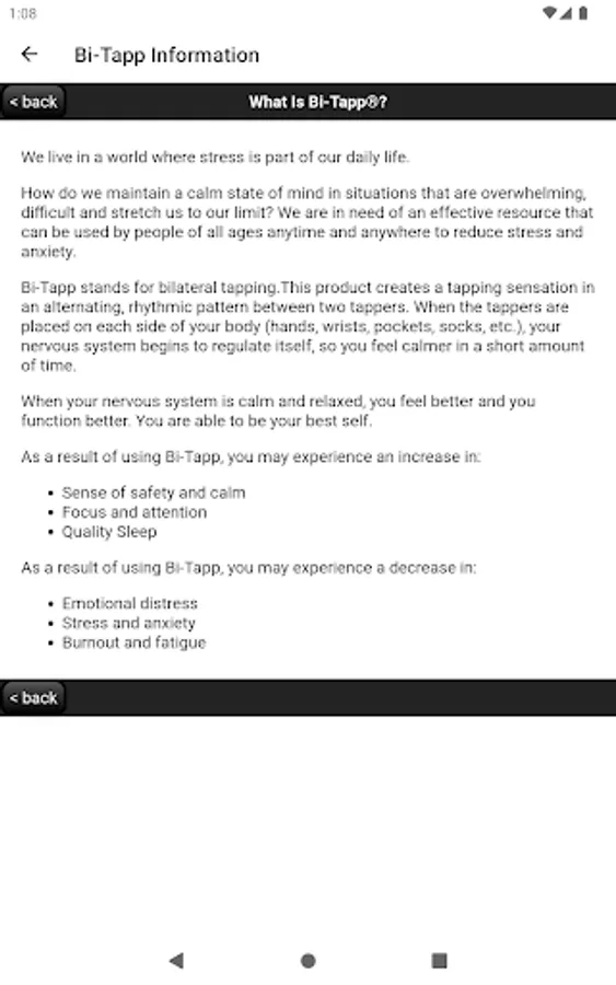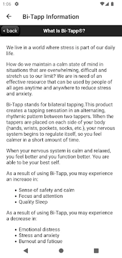 This App contains an information tab to provide additional information on how to use this product. Note: Bi-Tapp is not meant to replace mental health therapy or medical treatment. Individual results may vary.
