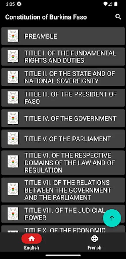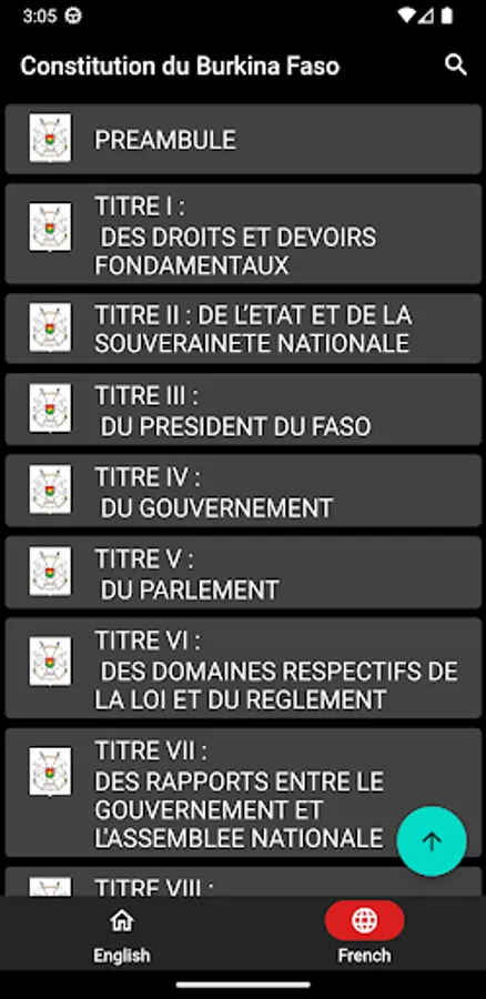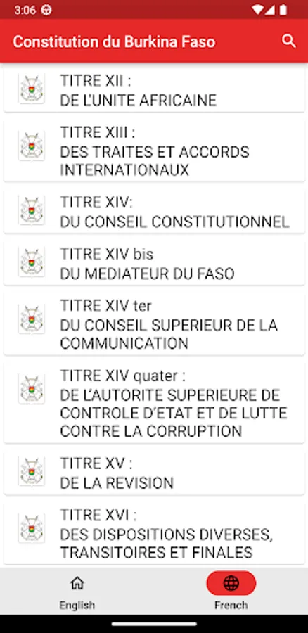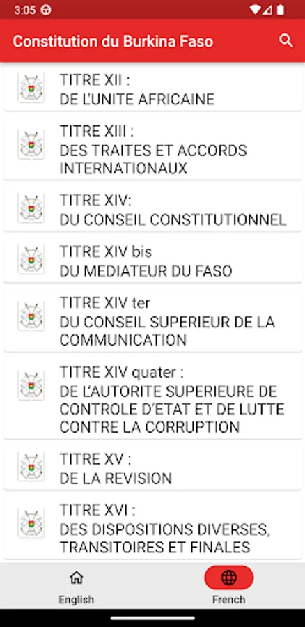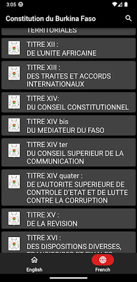 This app contains the constitution of the Republic of Burkina Faso in both English and French languages.