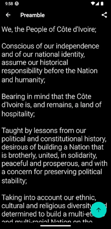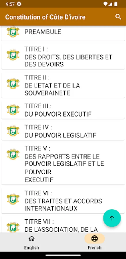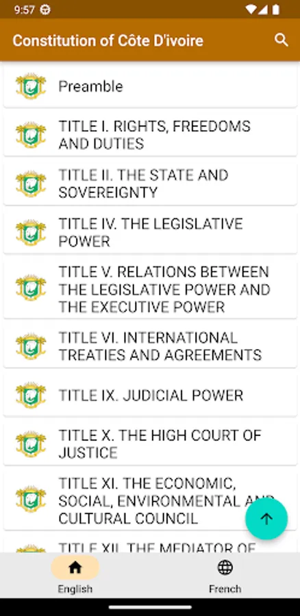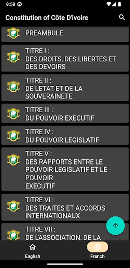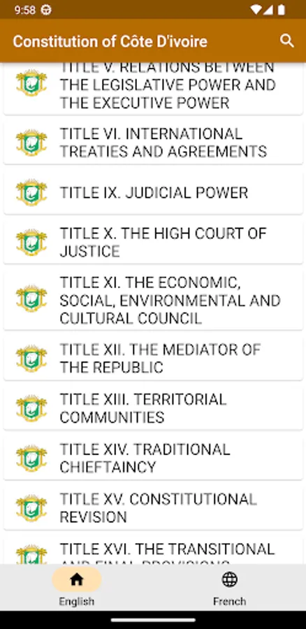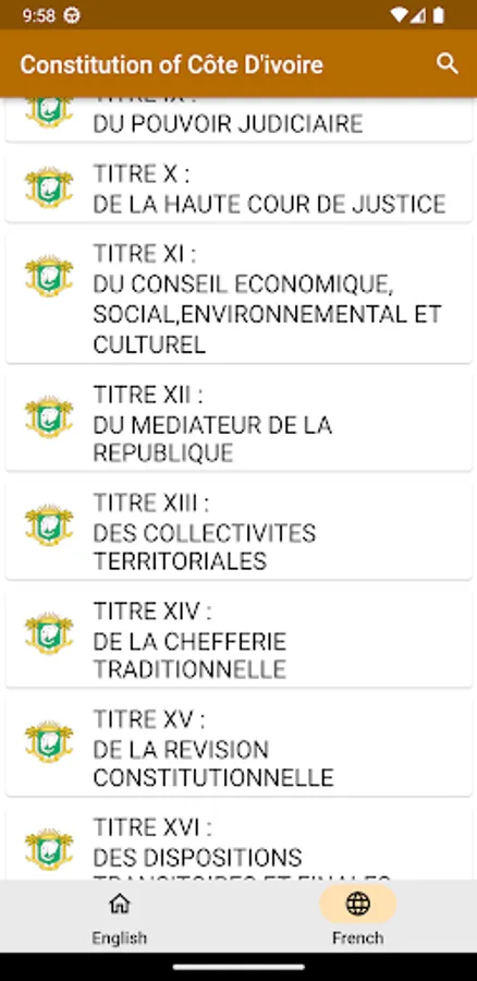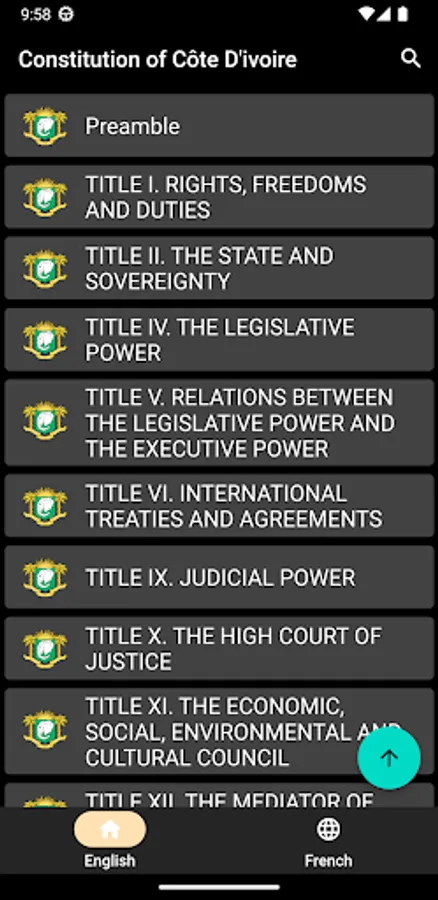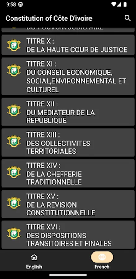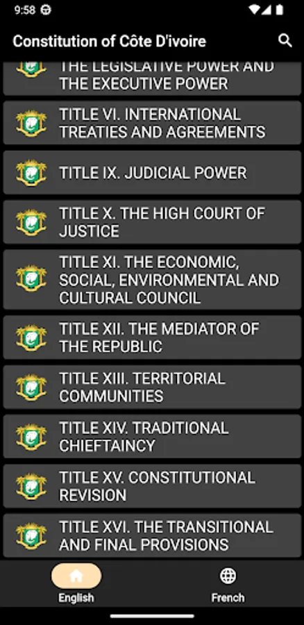 This app contains the constitution of the Republic of Côte d'Ivoire in both English and french.