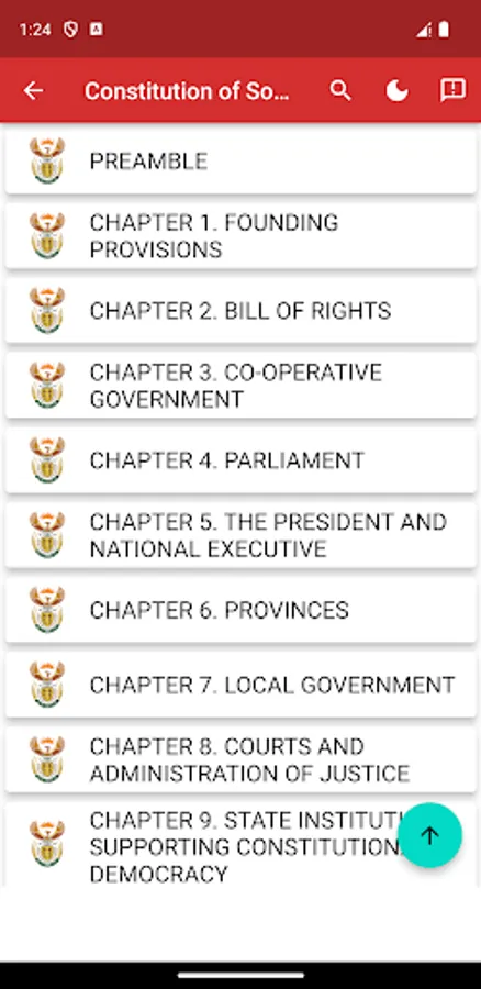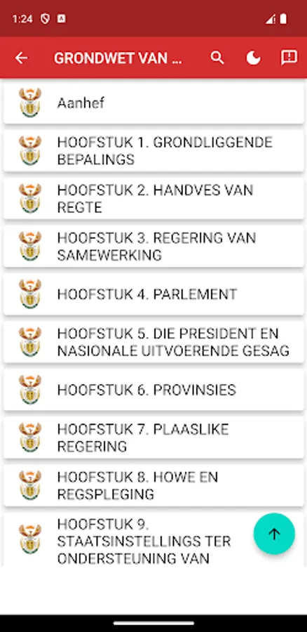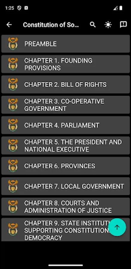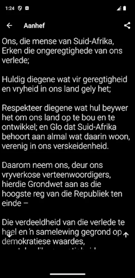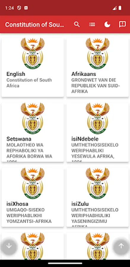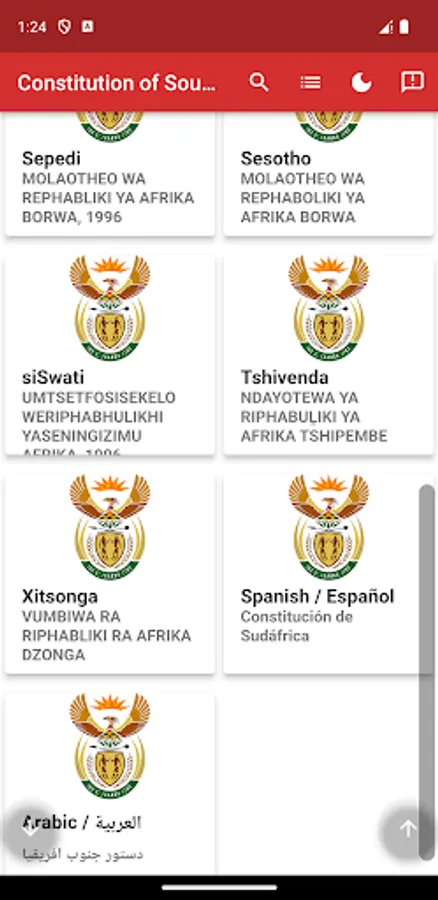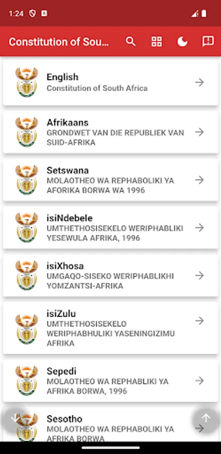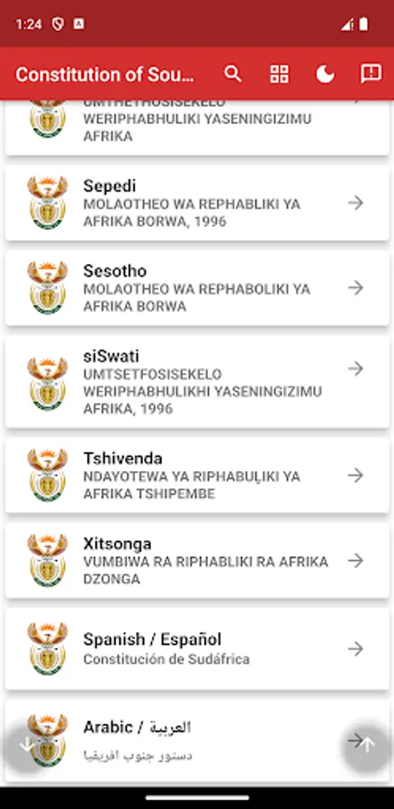 This application contains South Africa's Constitution of 1996 with Amendments through 2012 in Afrikaans, English, IsiNdebele, IsiXhosa, IsiZulu, Sepedi, Sesotho, Setswana, Siswati, Tshivenda, Xitsonga, Spanish, and Arabic.