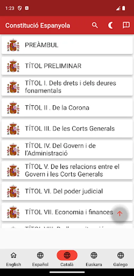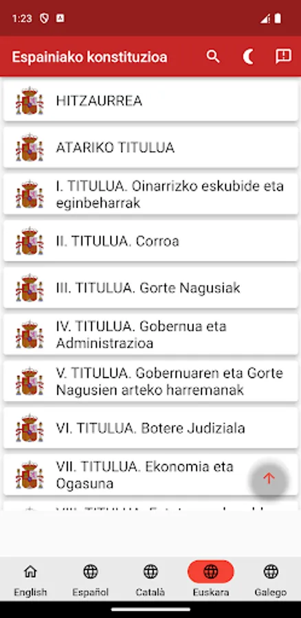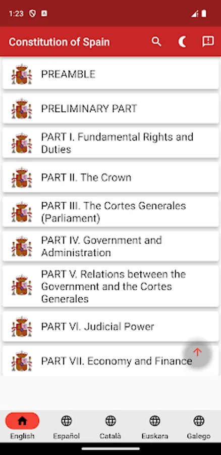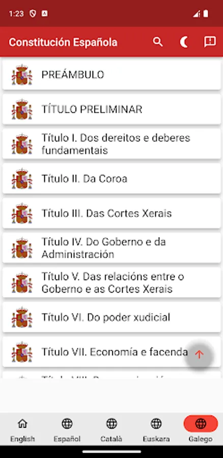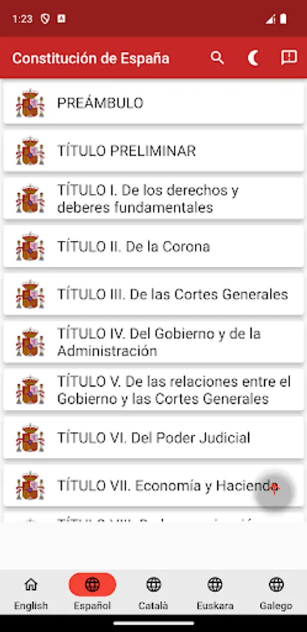 This application contains the Constitution of Spain in English, Spanish, Català, Euskara, Galego