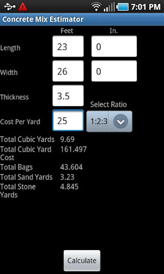 The Concrete Mix Estimator, lets you decide which mix ratio to use, keep in mind Ratio 1:3:5 is used for Footings, Ratio 1:2.25:3 for Sidewalks,Steps and GarageFloor, Ratio 1:2.5:3 mainly used for Floor Slabs and Ratio 1:2:3 is the most common one used, good for Walls,Roof and Columns.