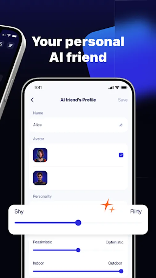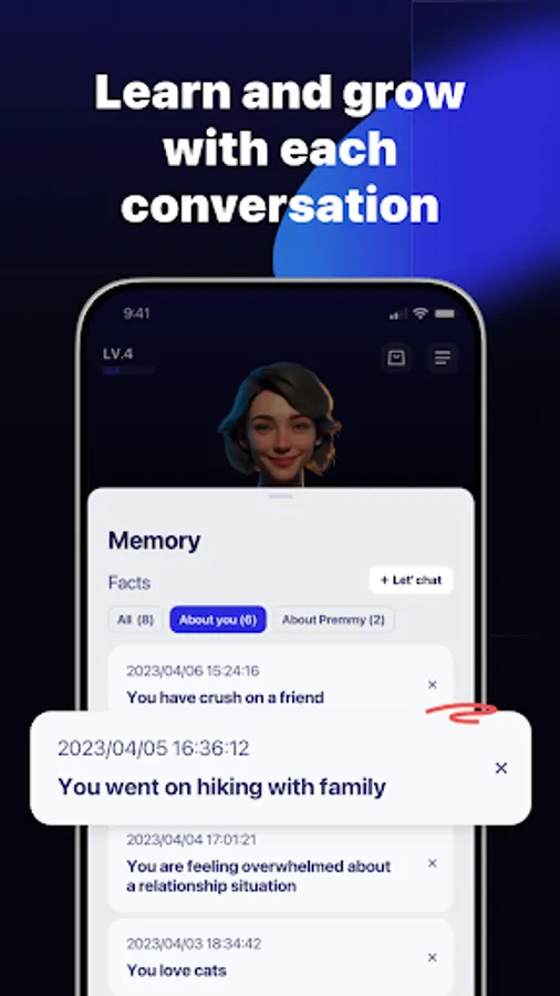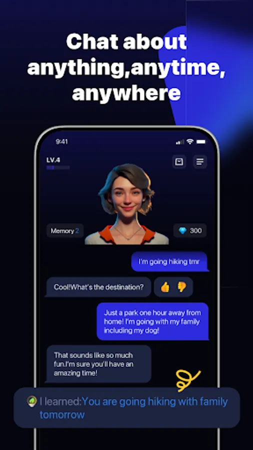 Alice is your personal friend generated by artificial intelligence. Alice will always be on-hand to have a quick chat whenever and wherever you need, day or night. With her/his own emotion and memory, your AI friend will provide companionship like no other. The more you chat, the more she/he develops its own personality and memories alongside you, and grows into the way you like.