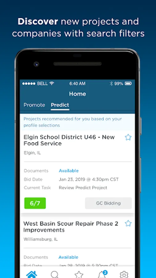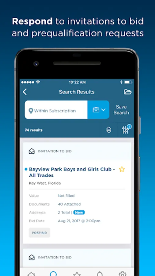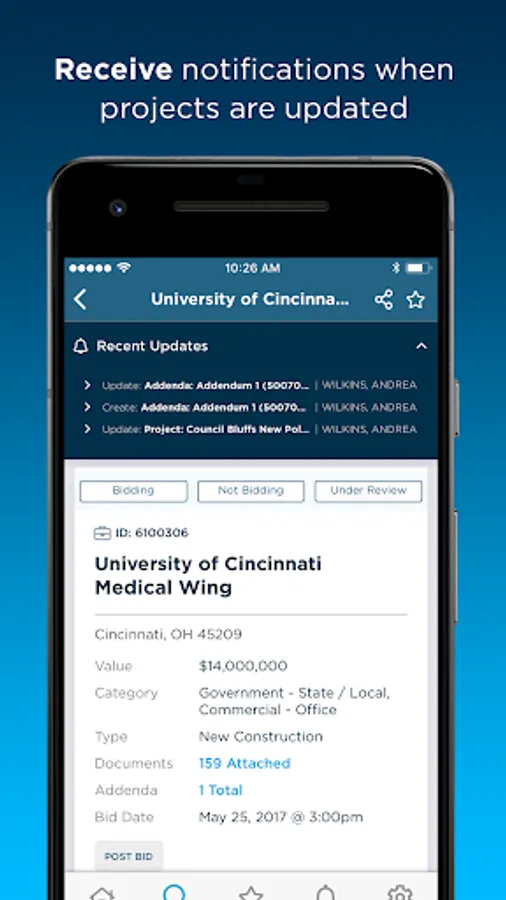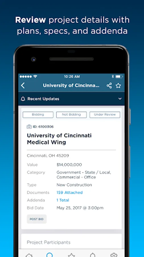 ConstructConnect for Contractors gives you instant access from anywhere to keep you in control of all your preconstruction projects. Review and manage ITBs, search for new project leads, and get notified when projects and companies you follow get updated. From the jobsite to the office, and everywhere in between, ConstructConnect for Contractors provides the tools necessary to stay organized and manage all your bidding opportunities.