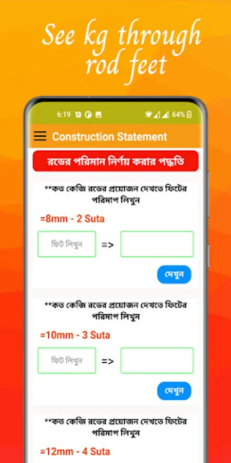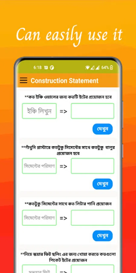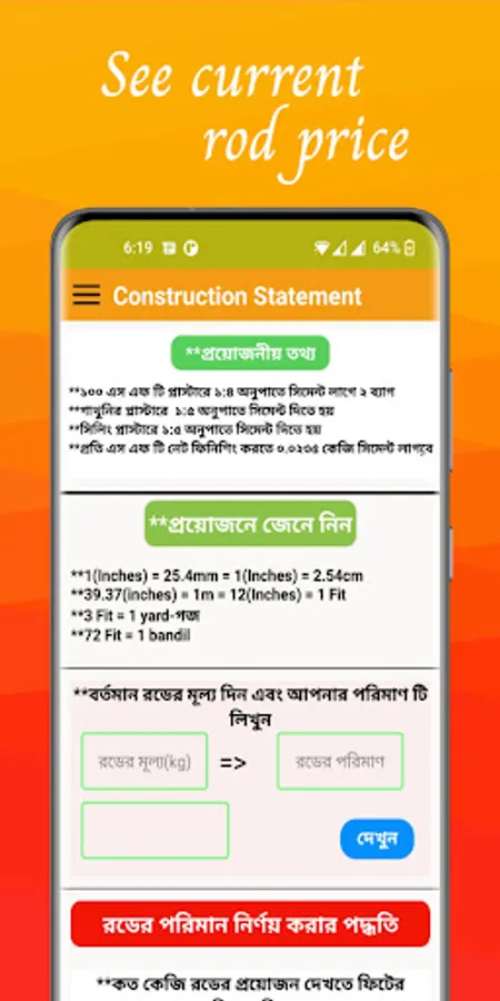 Using the app, you can see how many bricks are needed for a wall and how much water you need to use with some sand and cement or you can see how many picket bricks you need according to your designated feet. Look at the current rod price and you can easily determine how many kg of rod you need according to your designated feet.