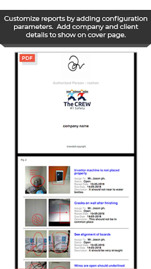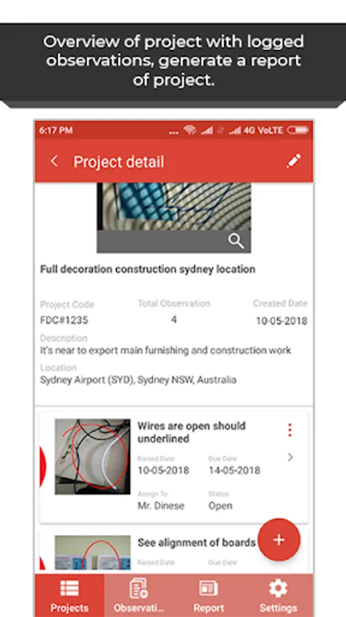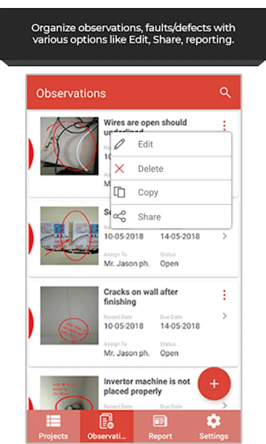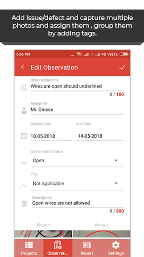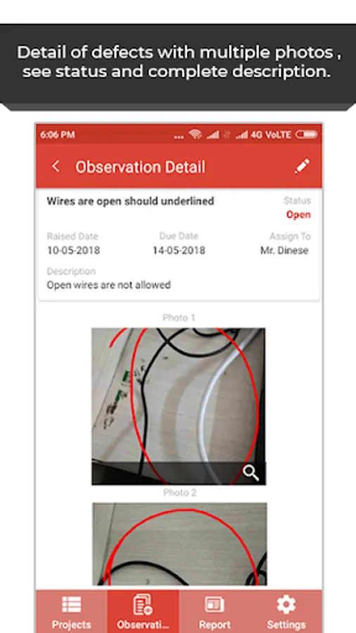 • Add Findings/observation with multiple photos and description that will help workers to fix easily.