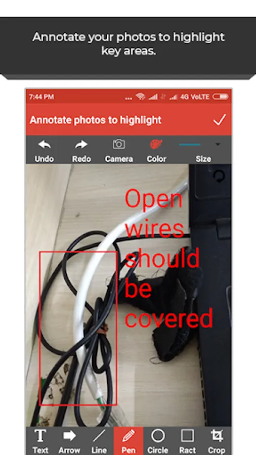 • Annotate the photo by highlighting the specific fault/issue using various shapes arrow, circle, rectangle, a border around the fault.