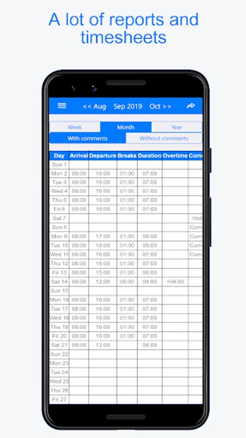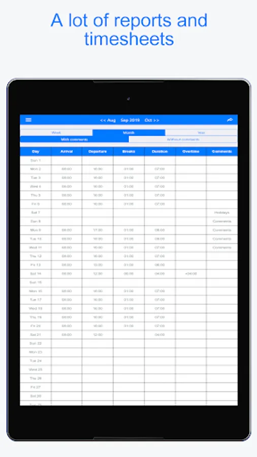 👍 Only one screen (calendar) to easily clock in and clock out each day and week your worked hours (arrival time, departure, breaks, comments and notes, hourly rate...). Create and use predefined hour templates (morning week, evening week…)