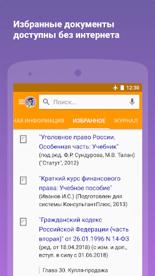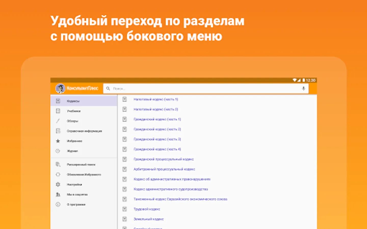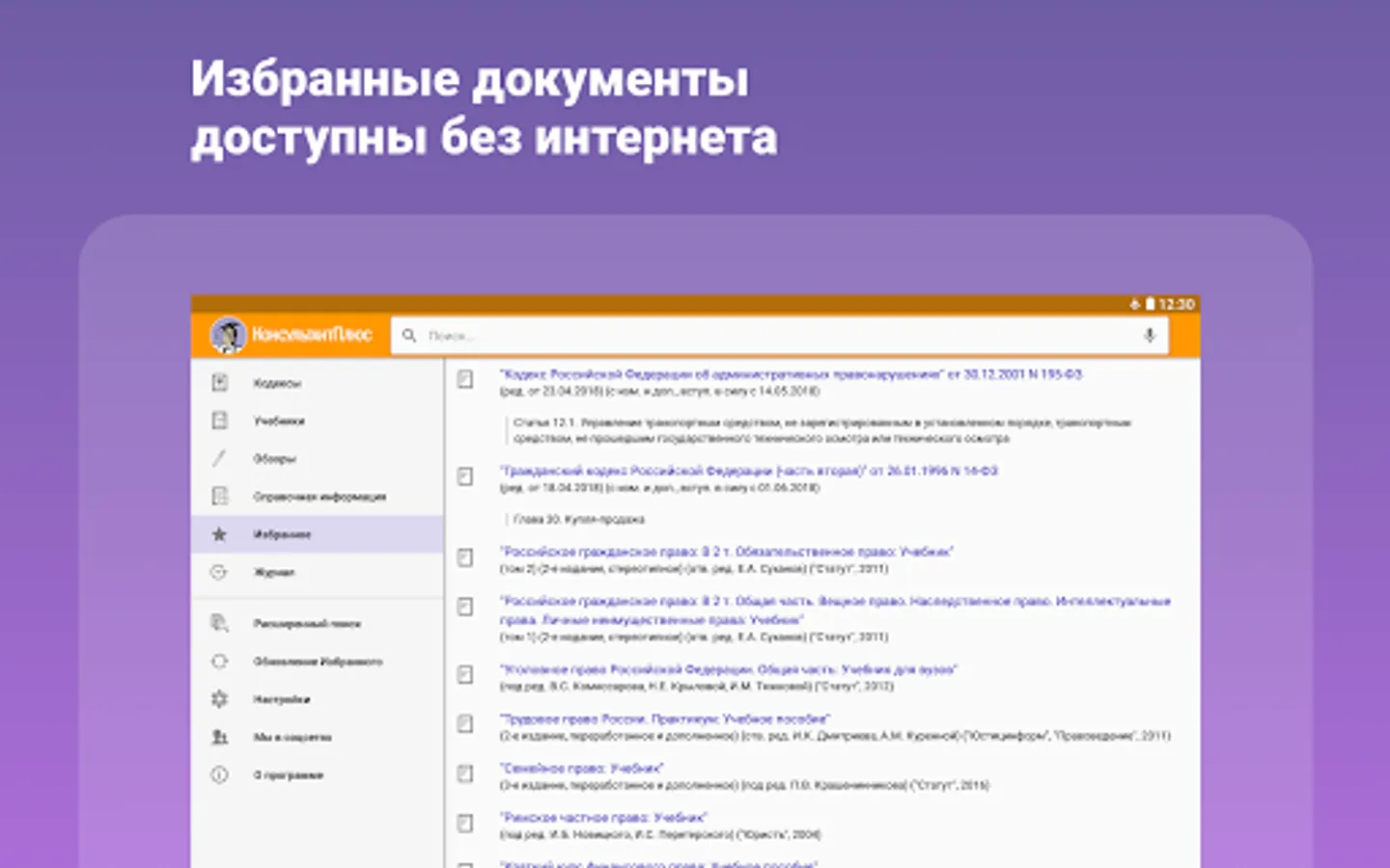 The ConsultantPlus application contains legal information (codes, laws), judicial practice, consultations, as well as modern textbooks on law, finance, economics and accounting. With this information, study and preparation for the session, writing term papers and theses will become easier.