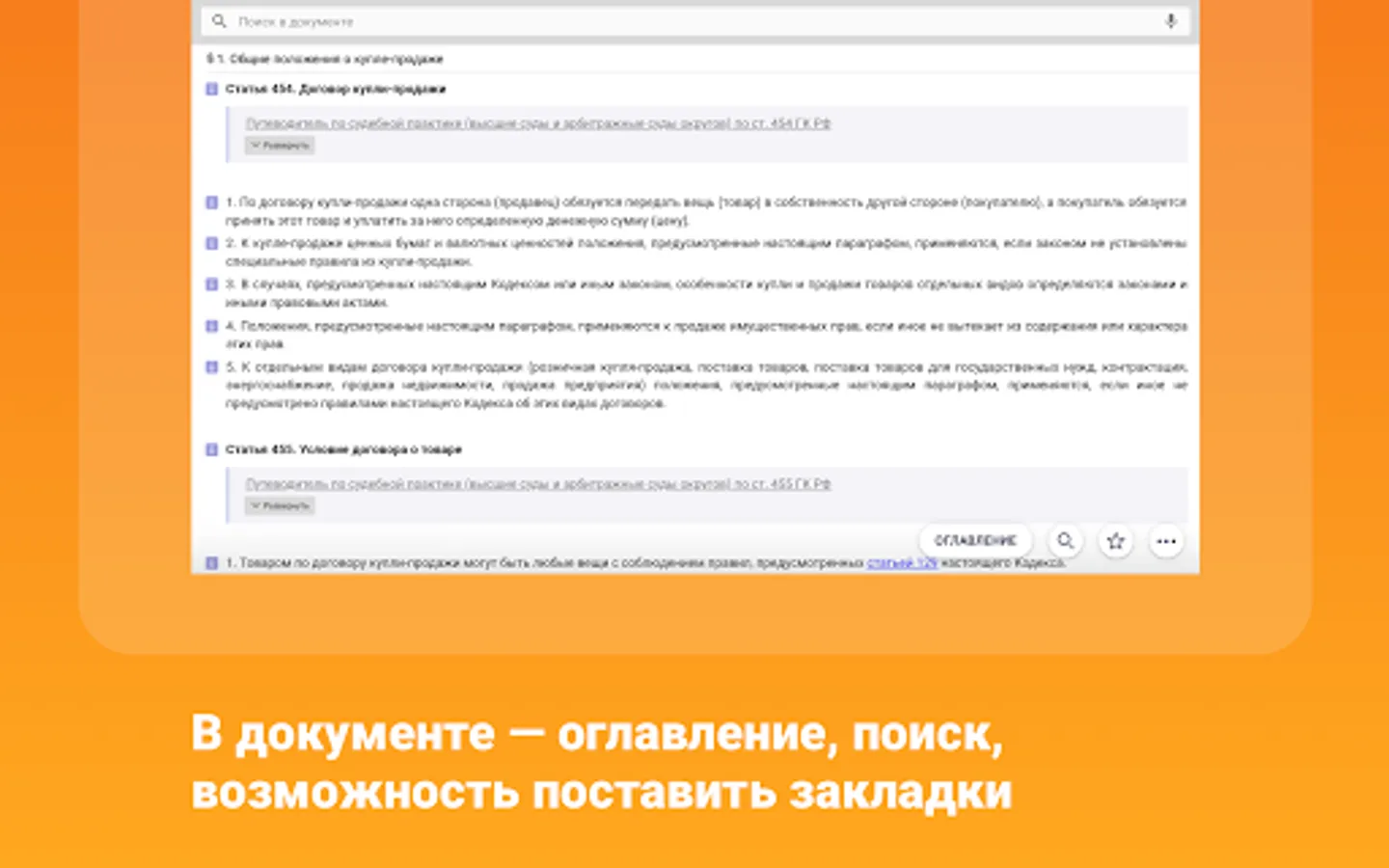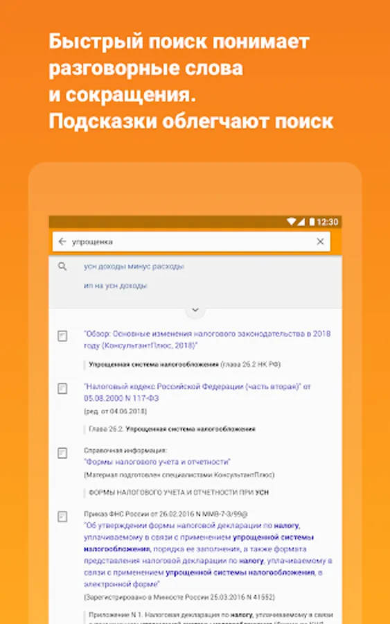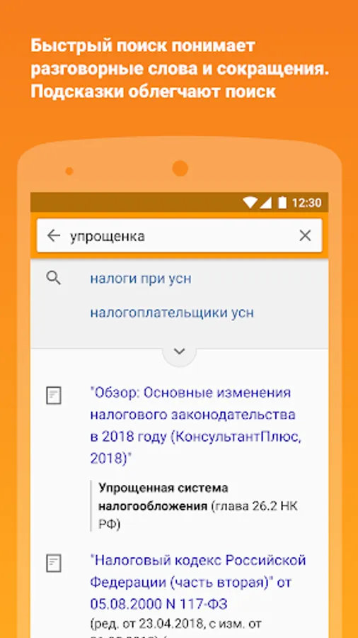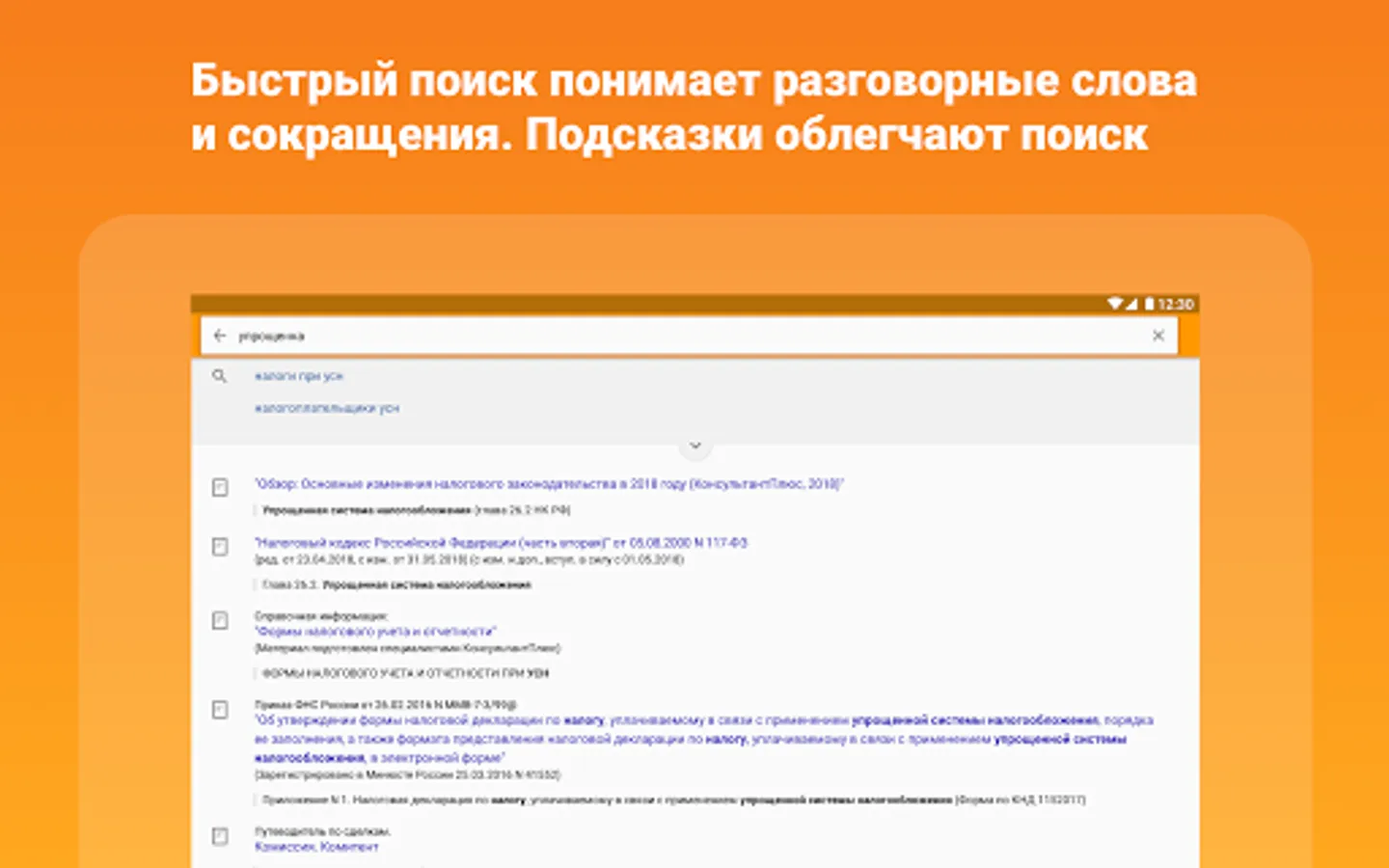 Use Quick Search. Just enter a question, concept, or describe a problem in the search box, as in an Internet search engine (for example, “how to renew a fixed-term employment contract”, “audit” or “ownership”), and the application will select documents with answers and solutions. The search understands such colloquial words and generally accepted abbreviations as “accounting” or “personal income tax”. For example, the query "VAT with simplification" will find documents that contain the words "VAT", "STS", as well as "value added tax", "simplified taxation system" in all case forms. To find a specific document, simply enter its name: "44 FZ", "budget", "family" or "land code" - and it will be the first in the list of found ones. Facilitates the work with the application, the ability to use abbreviations: UK, NK, GK, Administrative Code, CPC, Code of Criminal Procedure, TK, Criminal Code of the Russian Federation 2021, Civil Code of the Russian Federation 2022, etc.