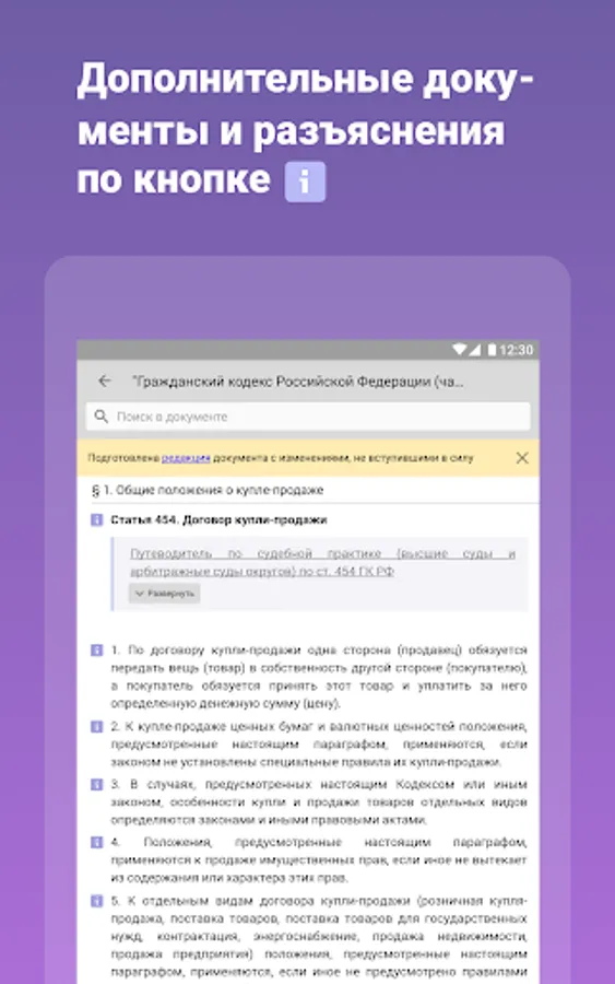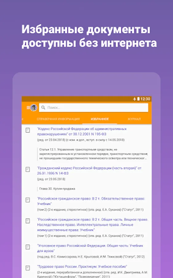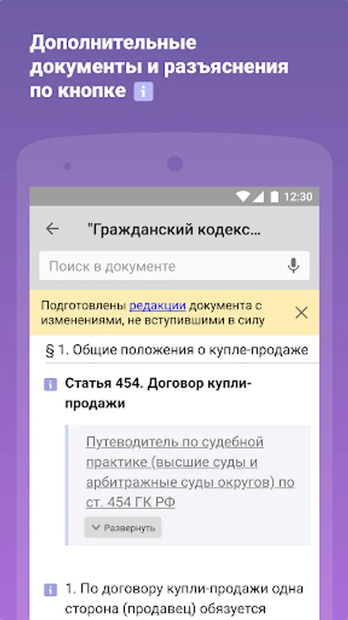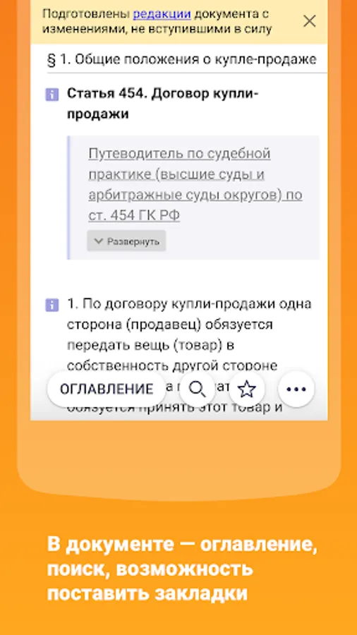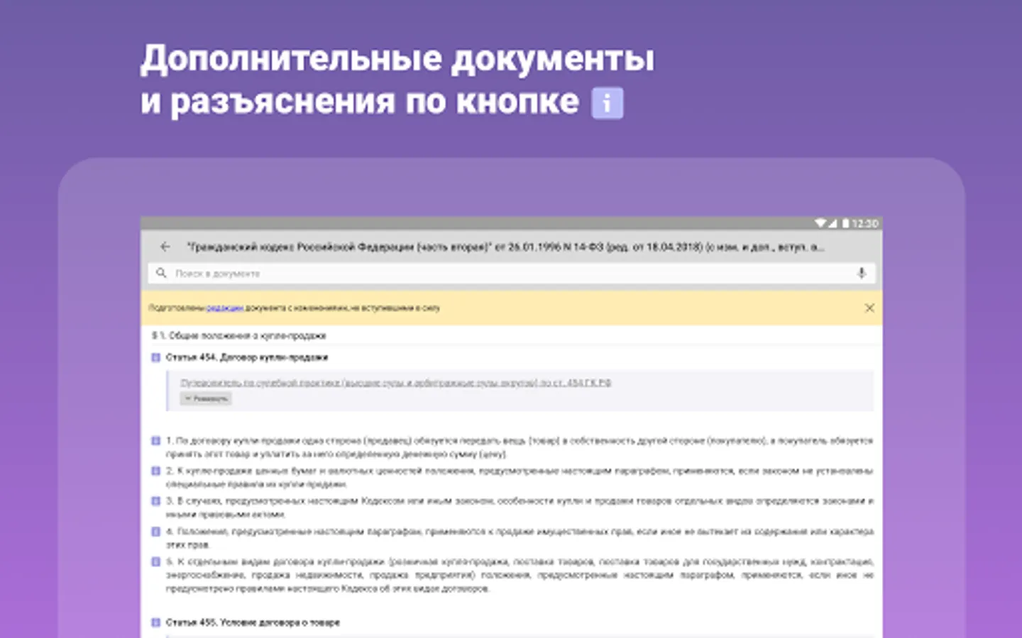 Use Quick Search. Just enter a question, concept, or describe a problem in the search box, as in an Internet search engine (for example, “how to renew a fixed-term employment contract”, “audit” or “ownership”), and the application will select documents with answers and solutions. The search understands such colloquial words and generally accepted abbreviations as “accounting” or “personal income tax”. For example, the query "VAT with simplification" will find documents that contain the words "VAT", "STS", as well as "value added tax", "simplified taxation system" in all case forms. To find a specific document, simply enter its name: "44 FZ", "budget", "family" or "land code" - and it will be the first in the list of found ones. Facilitates the work with the application, the ability to use abbreviations: UK, NK, GK, Administrative Code, CPC, Code of Criminal Procedure, TK, Criminal Code of the Russian Federation 2021, Civil Code of the Russian Federation 2022, etc.