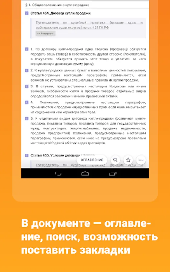 Navigating large documents (such as the Civil, Criminal or Tax Code) will help the table of contents and search in the text of the document. Each document is accompanied by a reference: even a novice lawyer or accountant can easily clarify the features and procedure for its application, the period of validity of the current version.
